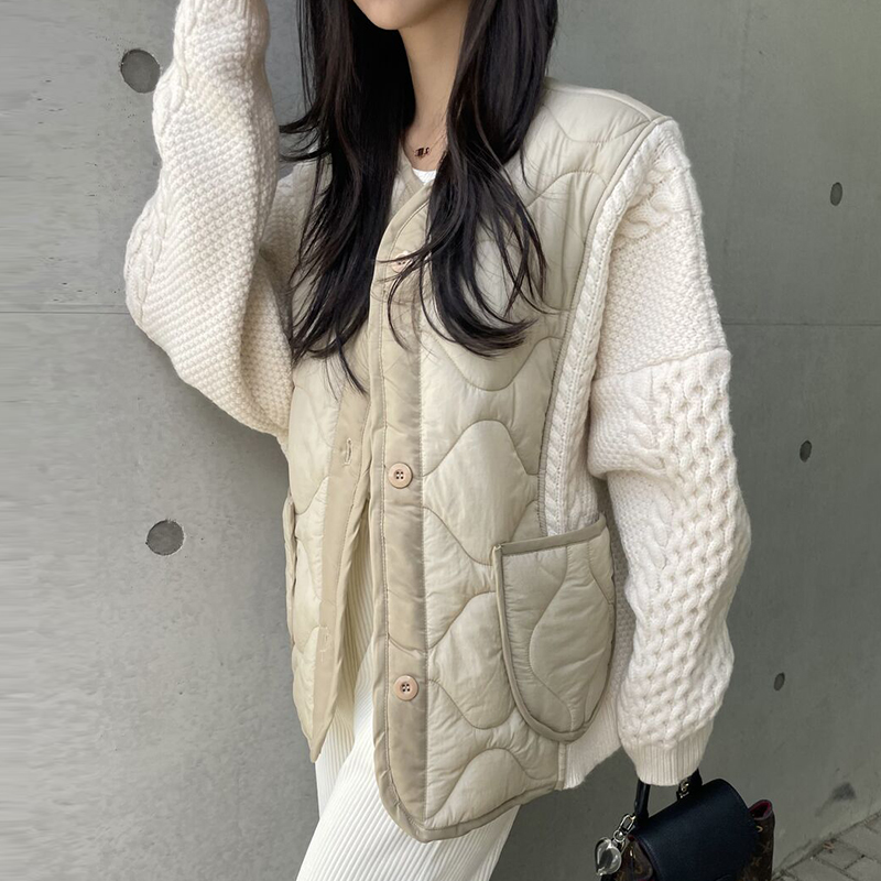 韩国chic秋冬小众百搭V领撞色拼接针织单排扣宽松长袖棉衣外套女