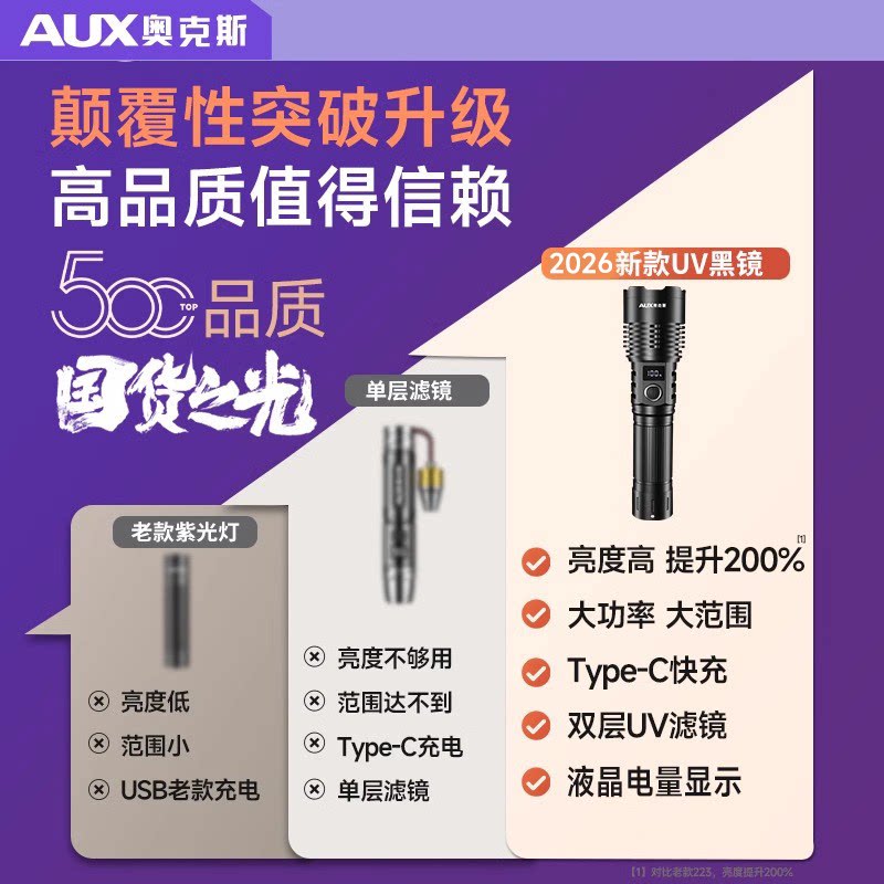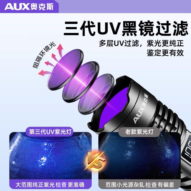 奥克斯紫光灯手电筒鉴定专用大功率365nm紫外线照玉石荧光剂uv灯