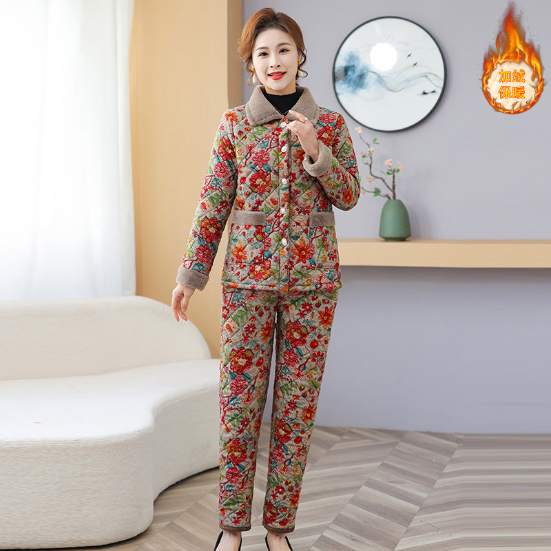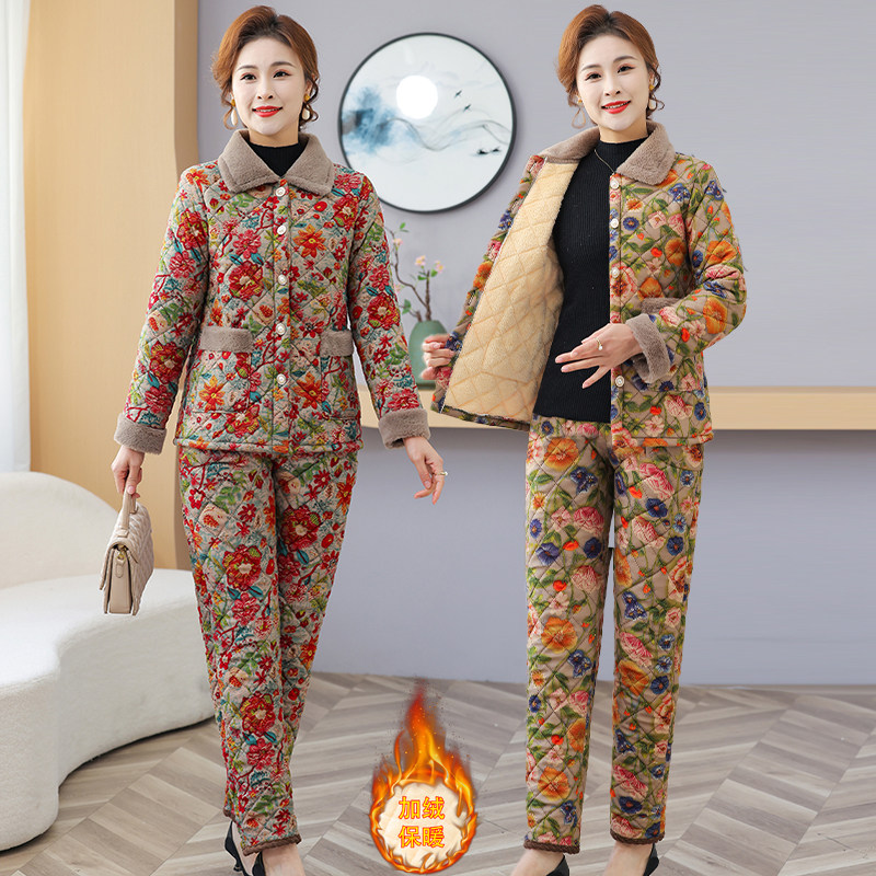 冬季棉衣棉裤套装妈妈装加绒加厚保暖两件套棉服中老年女大码棉袄