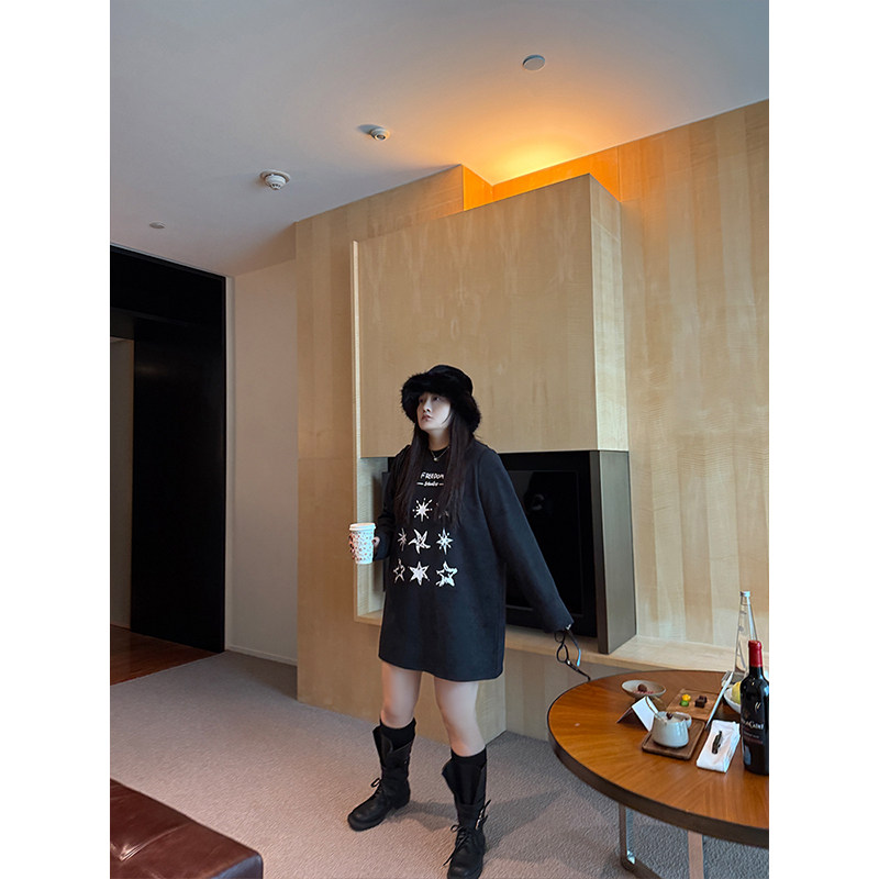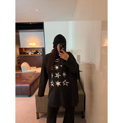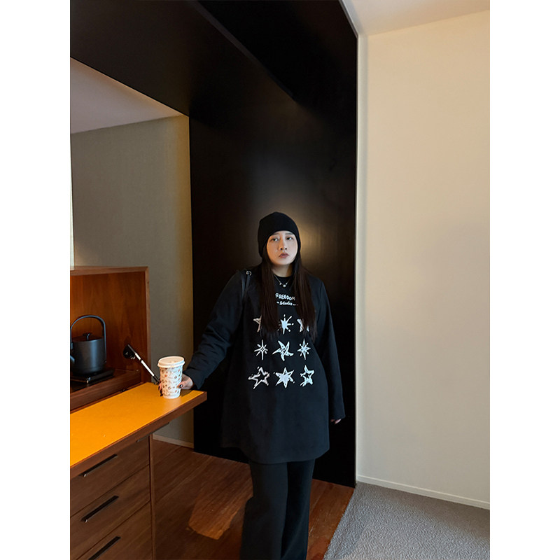 铅笔小鑫大码女装时髦感 星星印花松弛简约复古显瘦直筒T恤