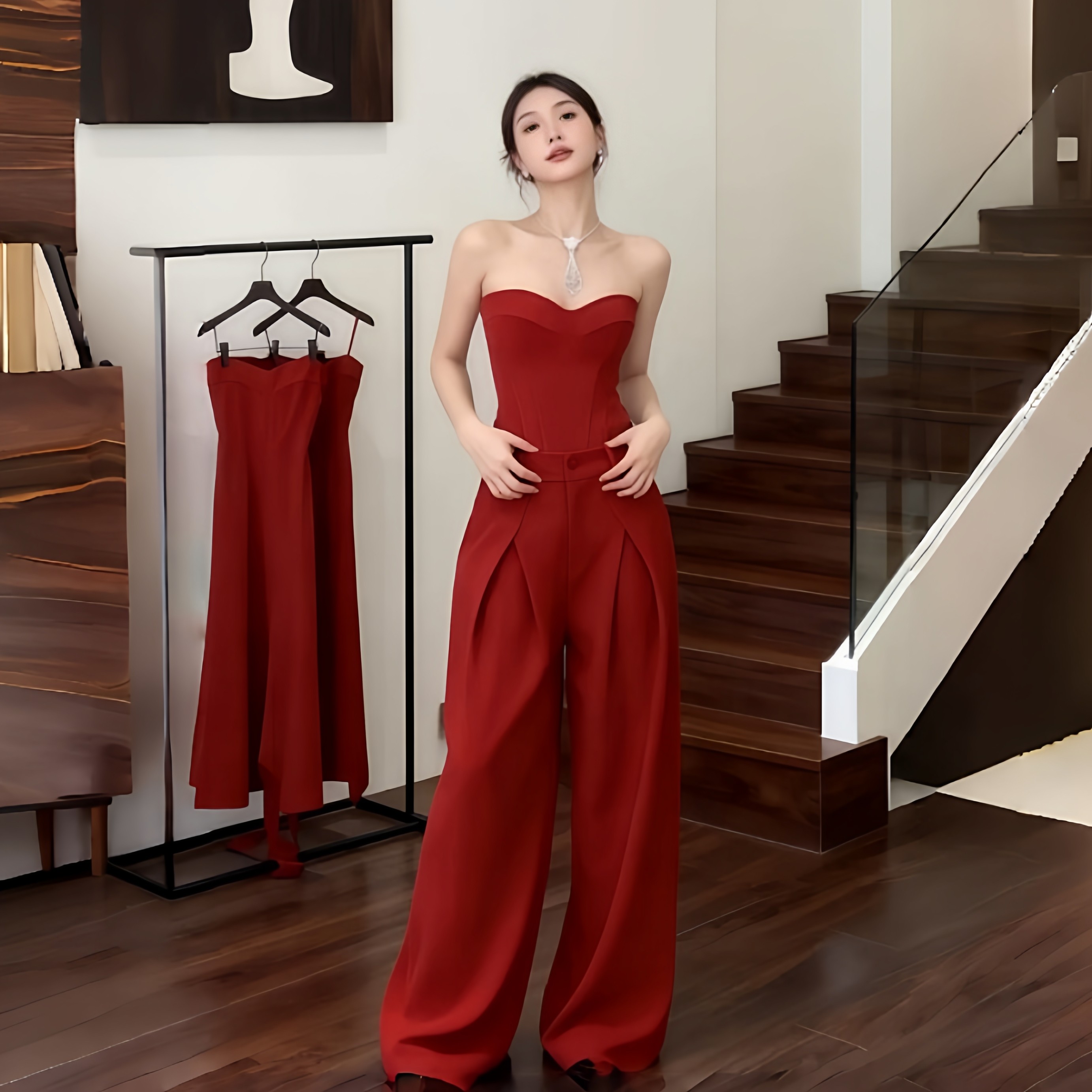 元旦跨年氛围感穿搭红色套装女秋季辣妹抹胸上衣直筒阔腿裤一整套
