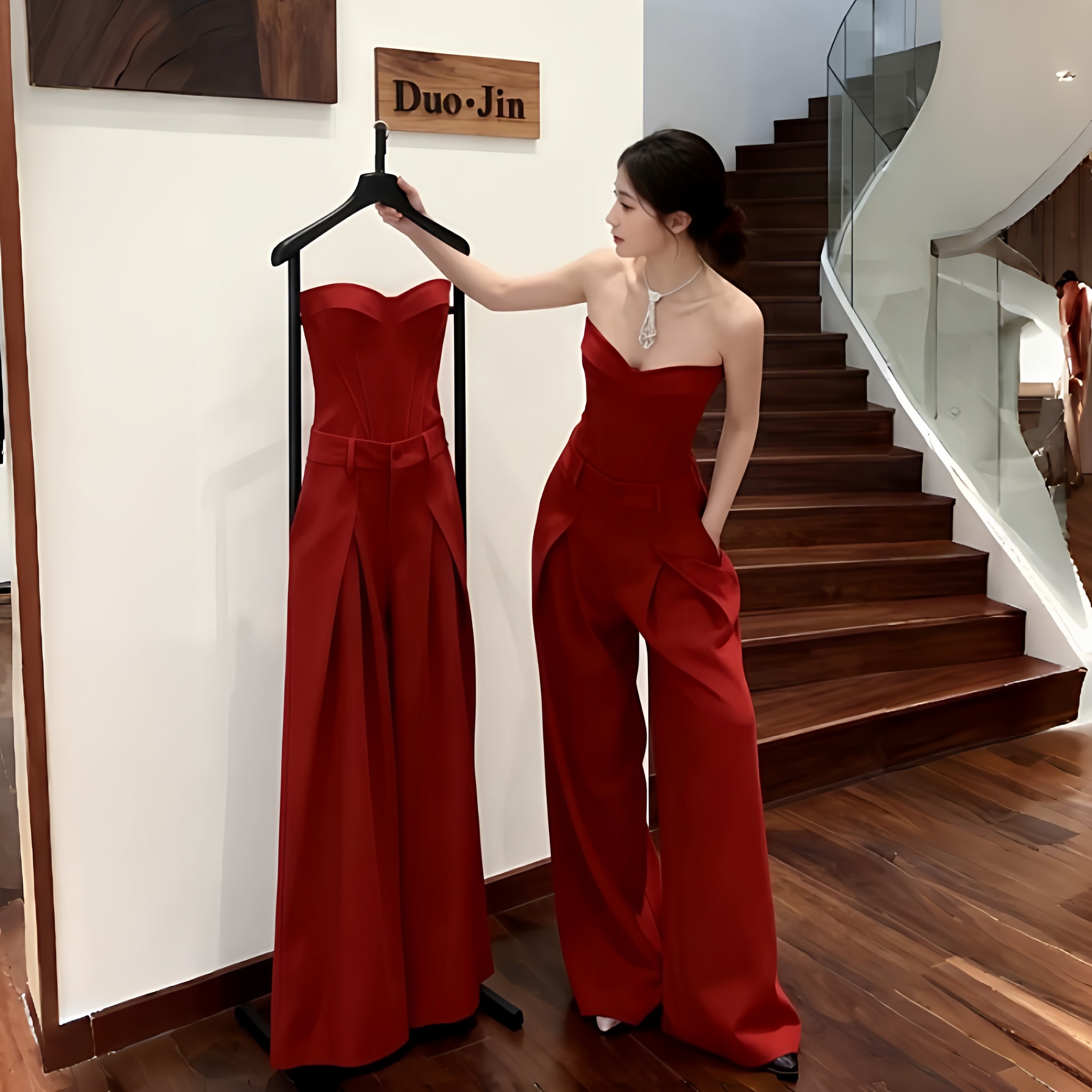 跨年轻奢媛鱼骨抹胸高腰阔腿套装