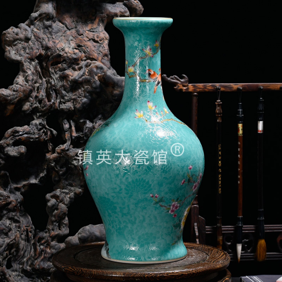 景德镇陶瓷花瓶仿古瓷器松石绿扒花粉彩中式客厅公司博古架摆件