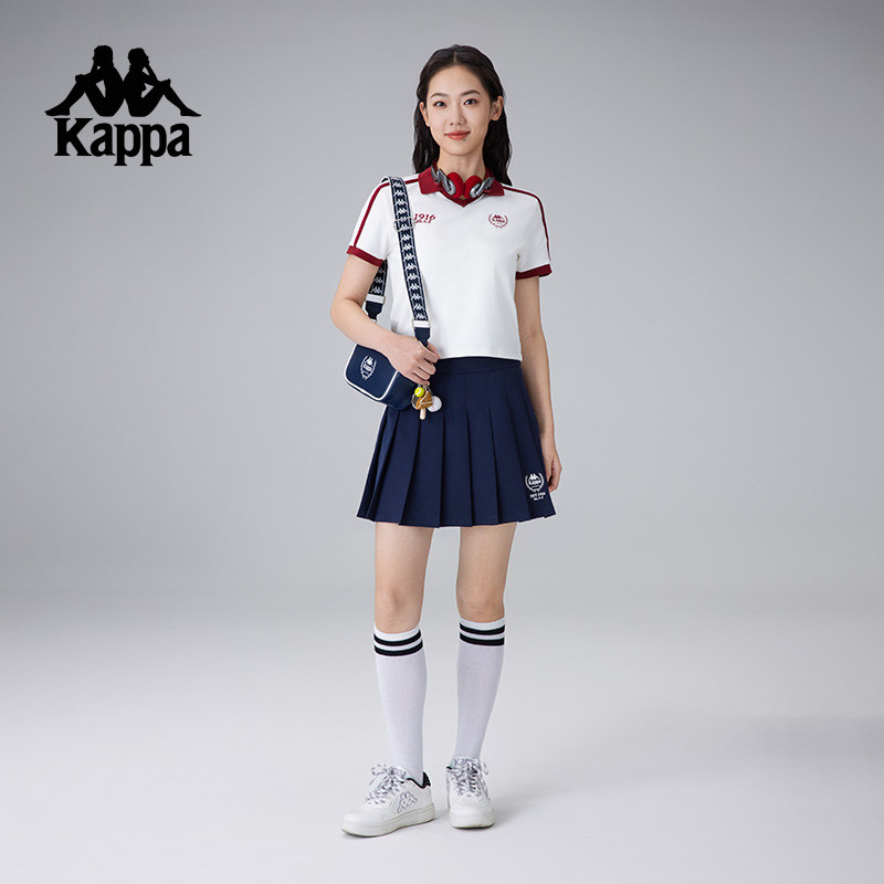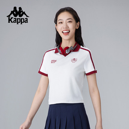 Kappa卡帕针织撞色小V领Polo衫女夏季户外休闲运动短袖上衣学院风