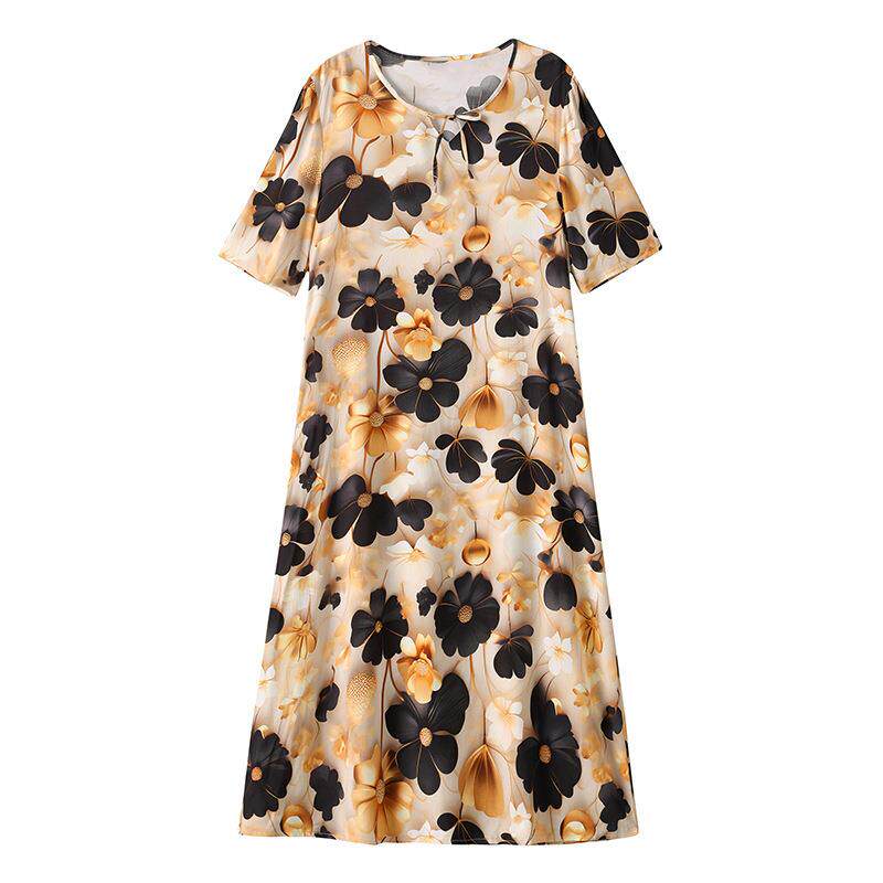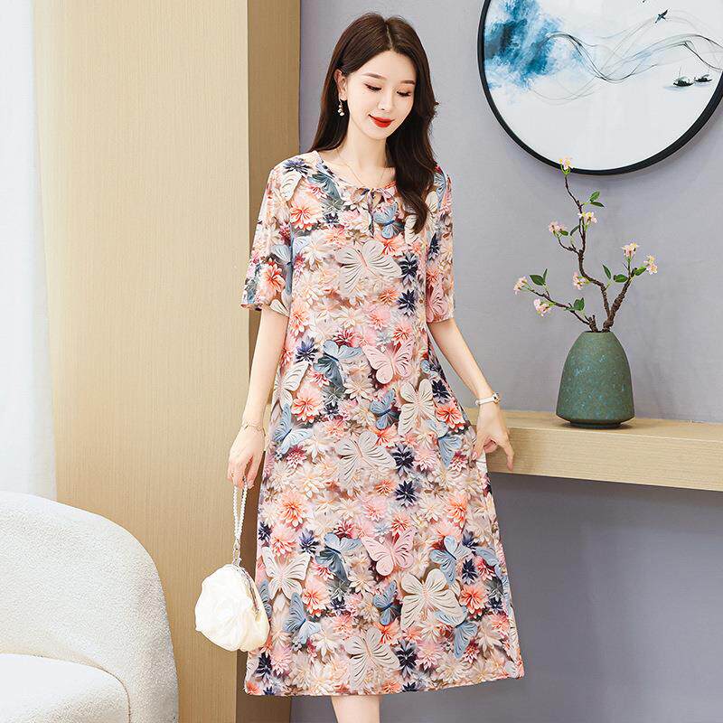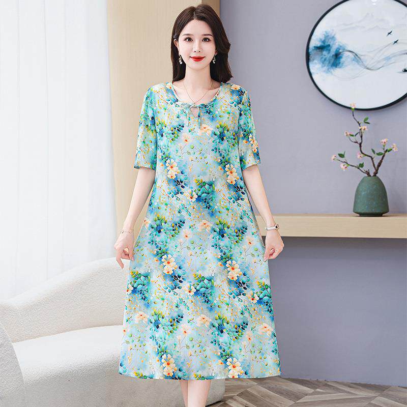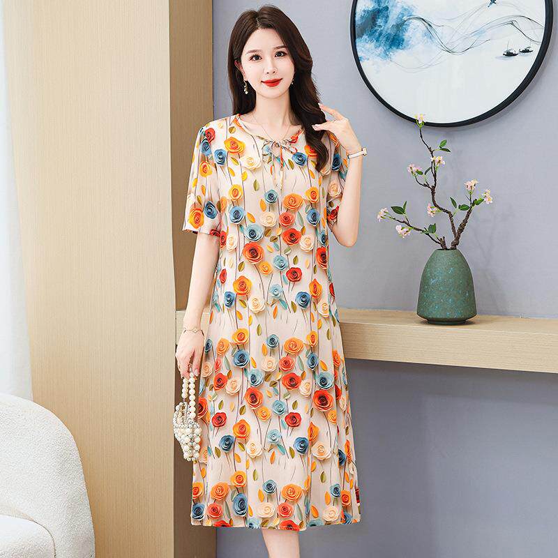 印花短袖高级连衣裙妈妈夏季新款3D裙子感棉绸气质2025中老年立体