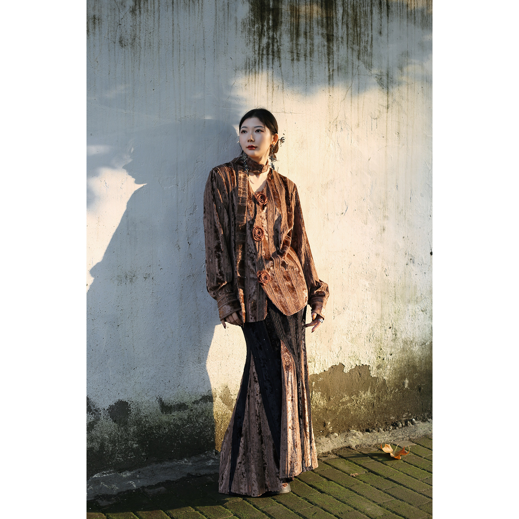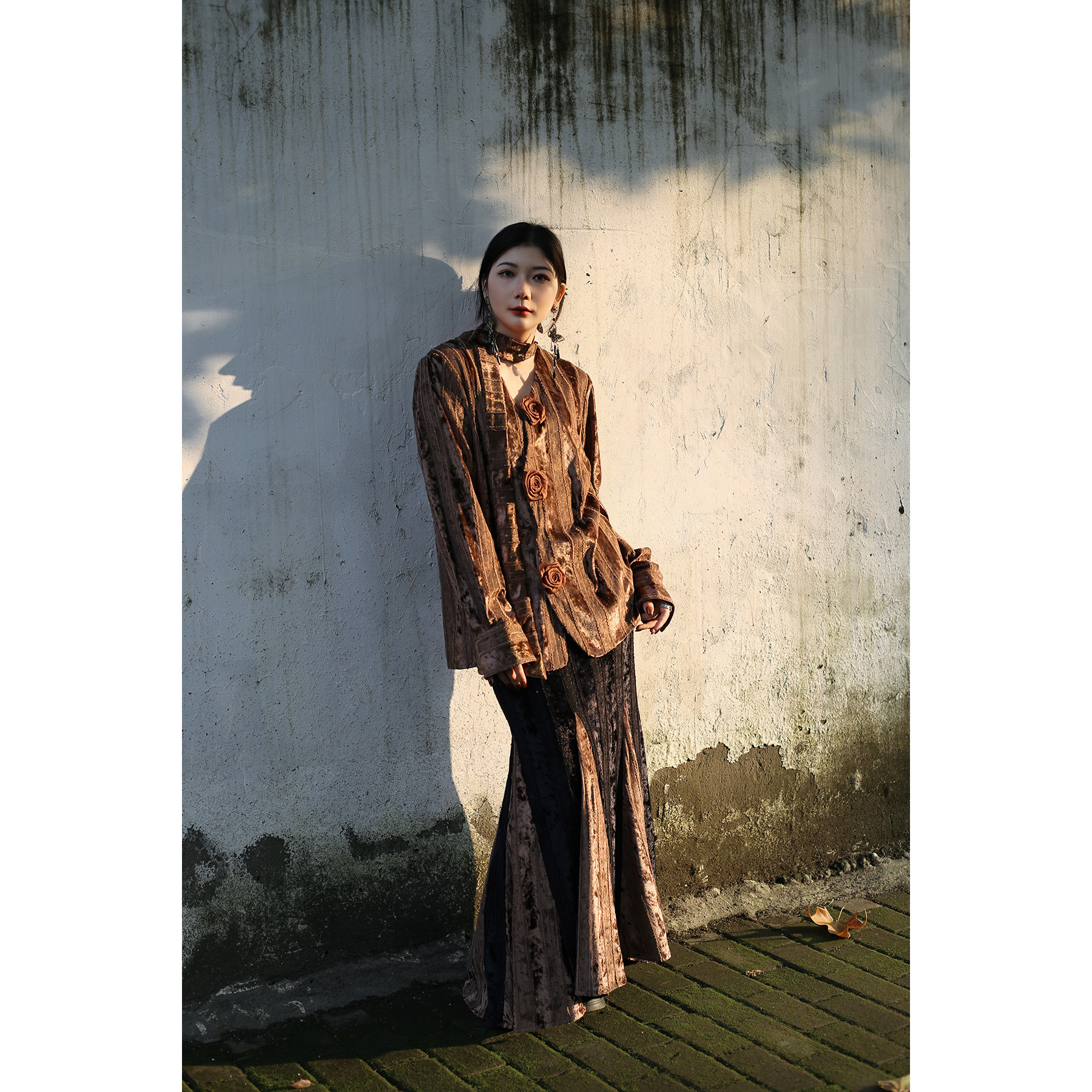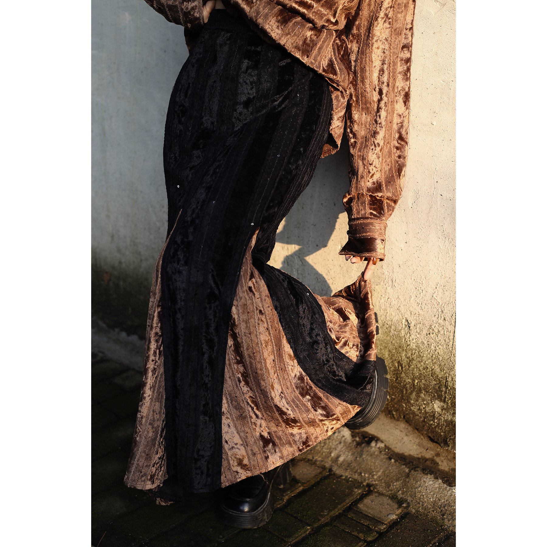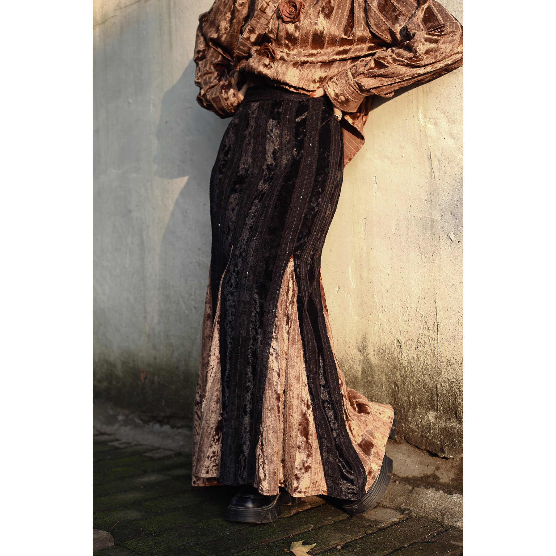 真大鱼大小码【褐绫】原创新中式重工复古丝绒拼接鱼尾裙半身裙新