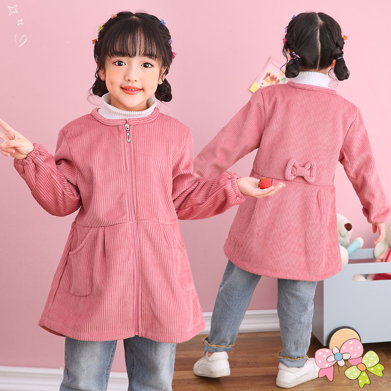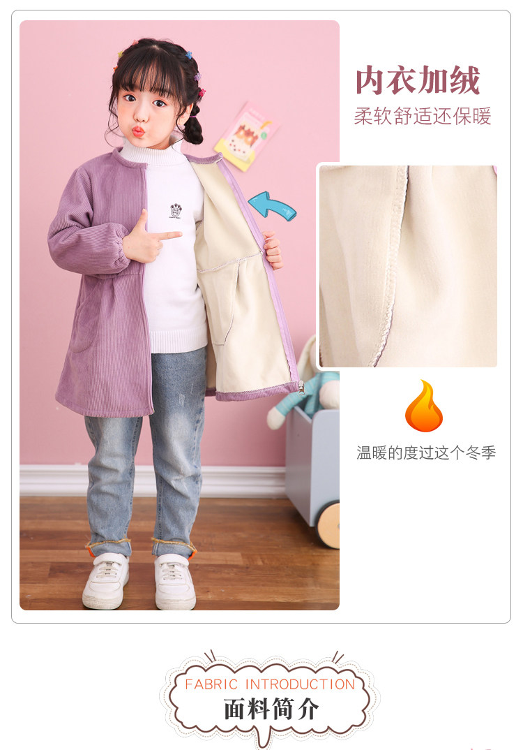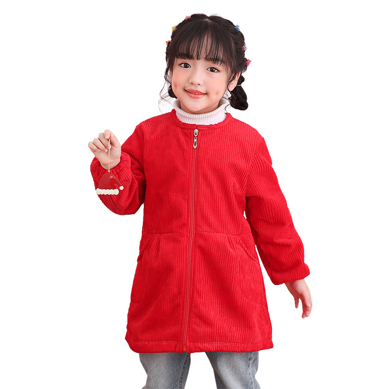 女童灯芯绒罩衣女宝羽绒服加厚加绒围兜长袖拉链画画吃饭反穿衣