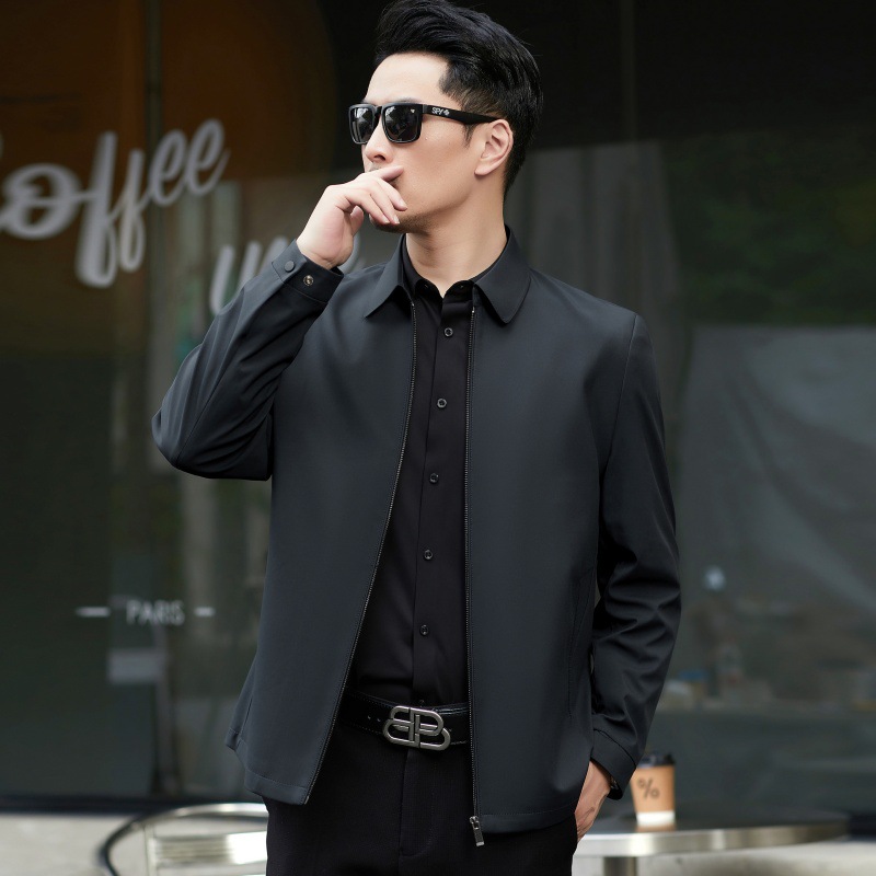 欧兰莎娅中年男士桑蚕丝夹克秋季翻领商务休闲外套男薄爸爸装上衣