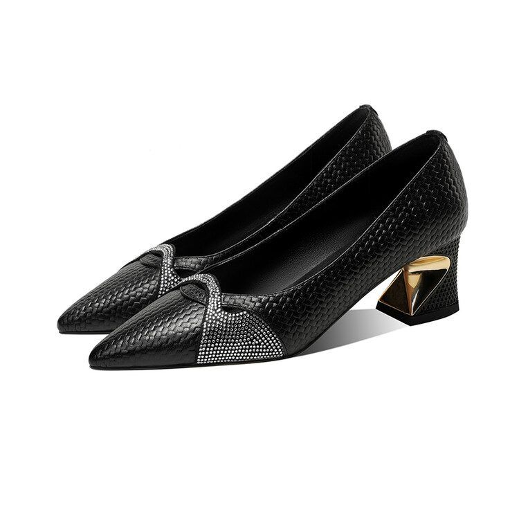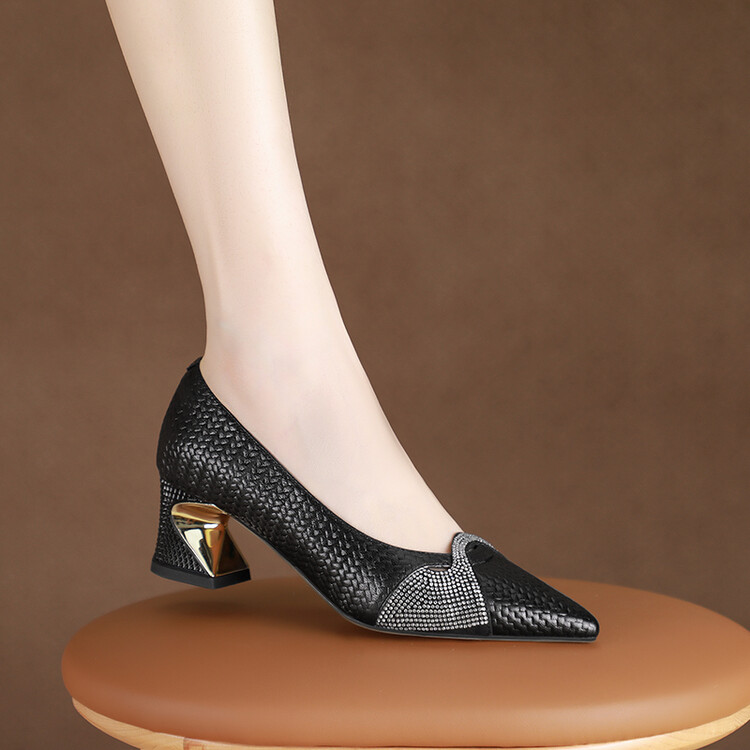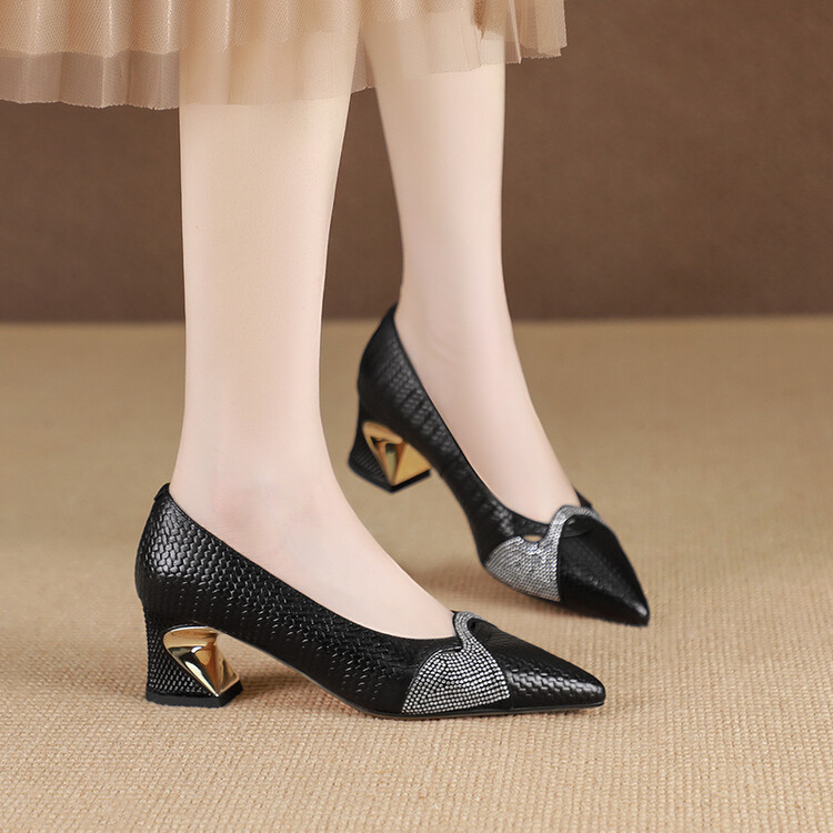 真皮水钻浅口单鞋女2025新款春秋尖头粗跟时尚皮鞋拼色百搭高跟鞋