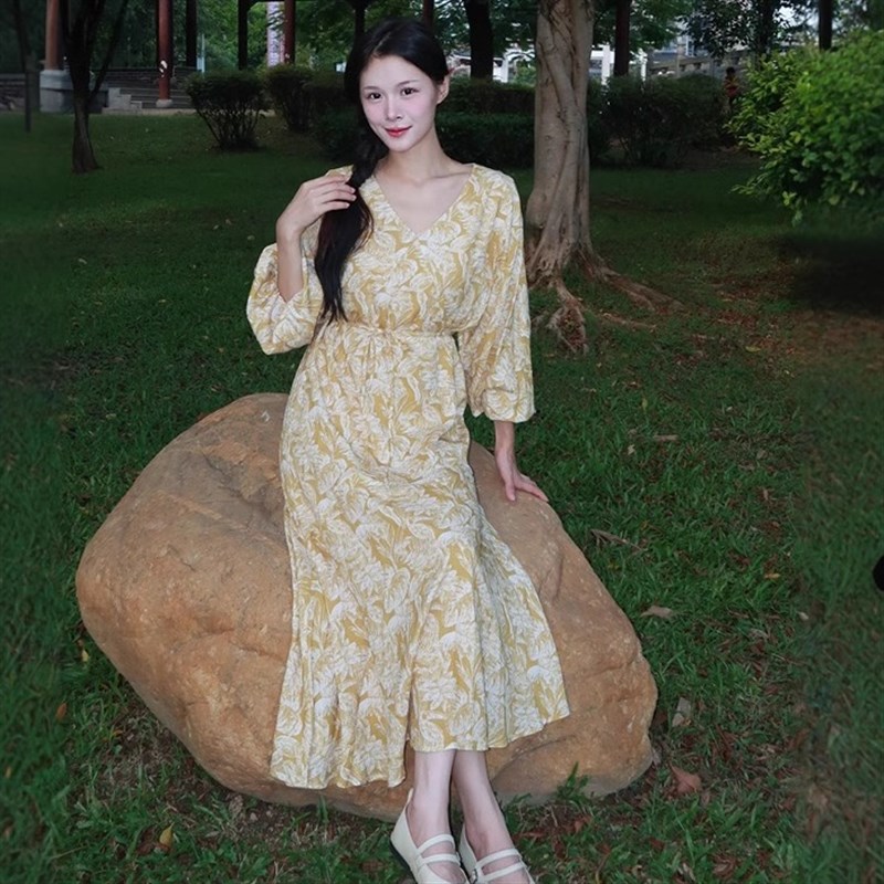 100%苎麻新中式花房碎花连衣裙女早秋V领长袖高腰宽松显瘦长裙子