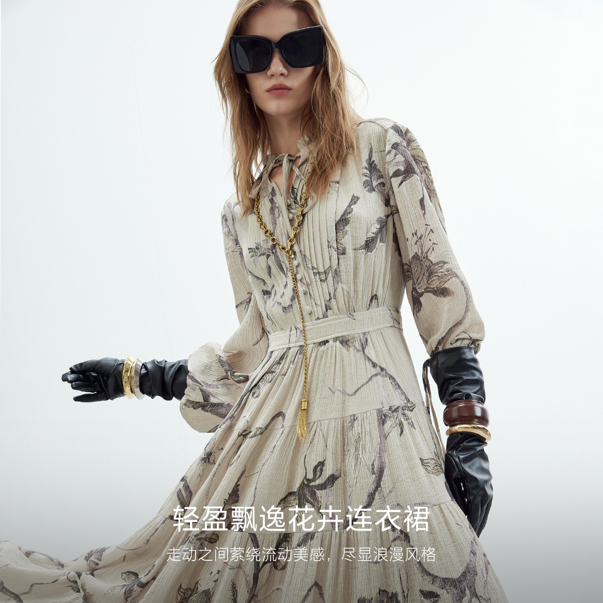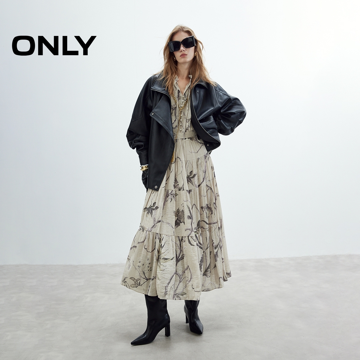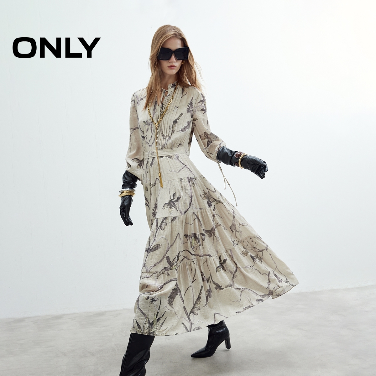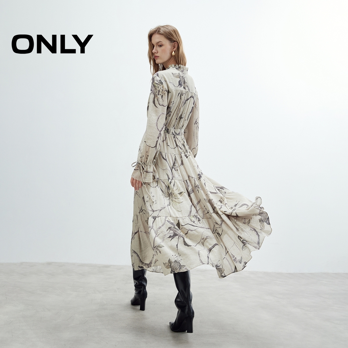 ONLY2025秋季新款波嬉风浪漫花卉印花飘逸伞裙长袖喇叭袖连衣裙