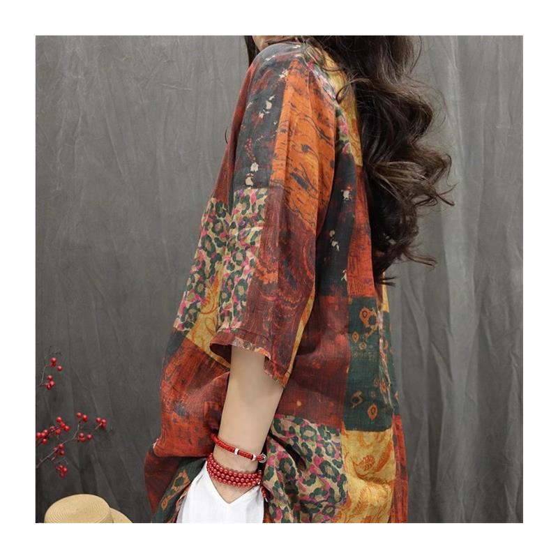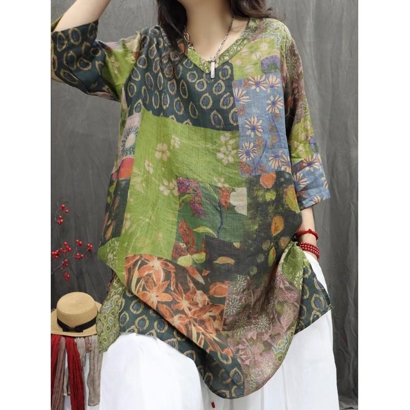 复古苎麻减龄气质印花衬衫女夏季薄款宽松显瘦V领中长款中袖上衣