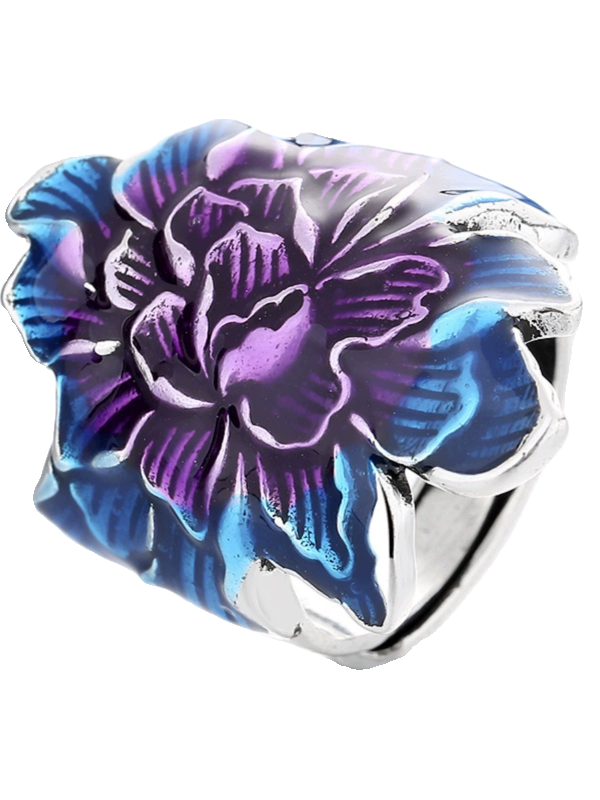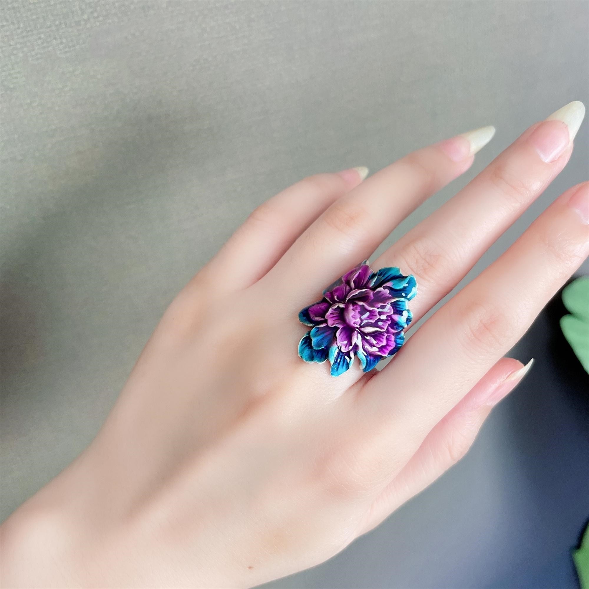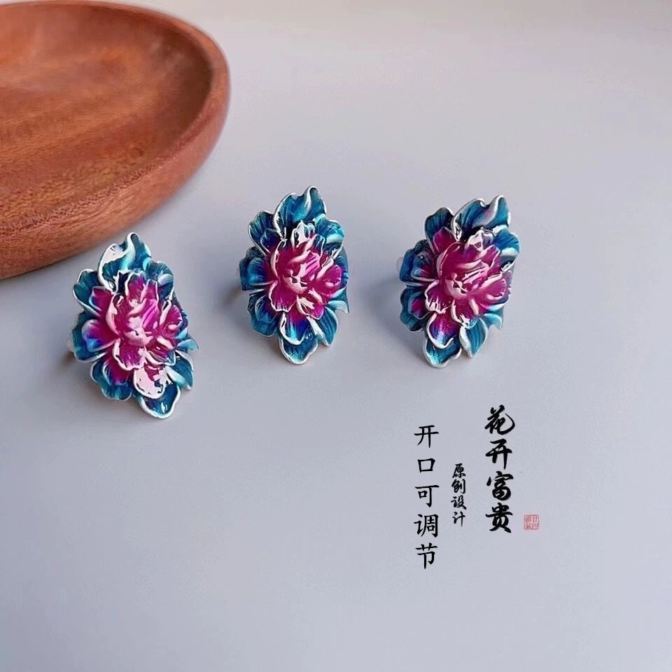 S925纯银烧蓝珐琅彩色牡丹花戒指女国潮复古国风做旧招财转运开口