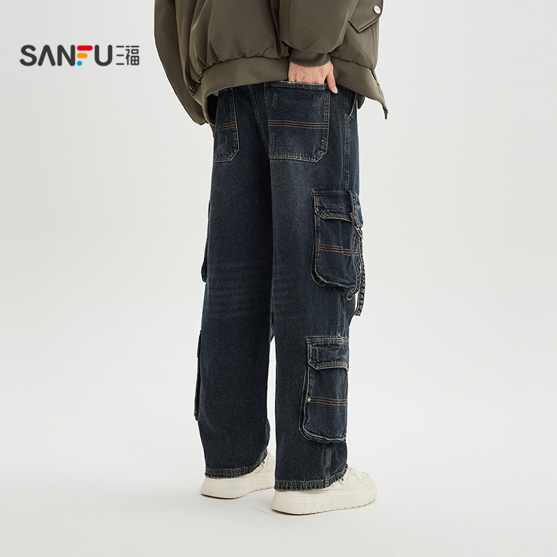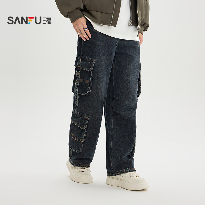 三福2025冬季男士工装磨毛牛仔裤 多口袋宽松直筒长裤511775