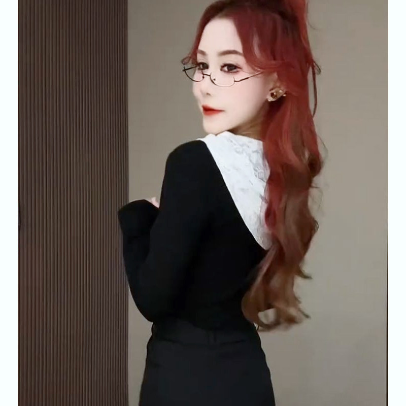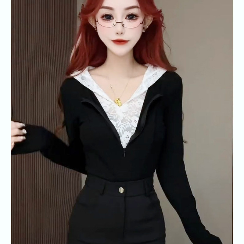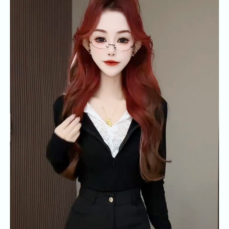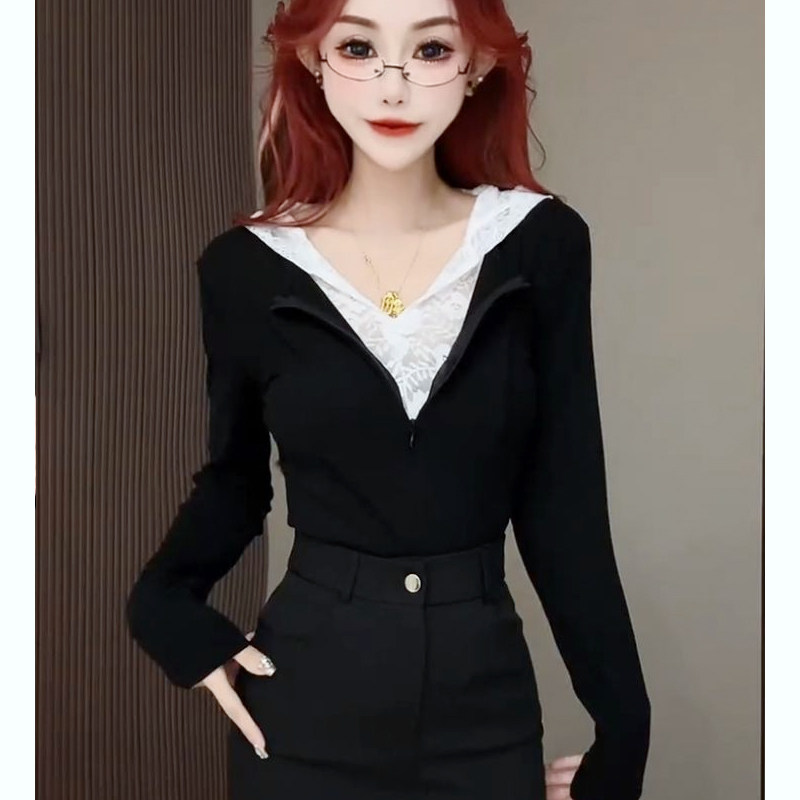韩系时尚假两件蕾丝拼接连帽长袖t恤女2025秋季新款气质显瘦上衣