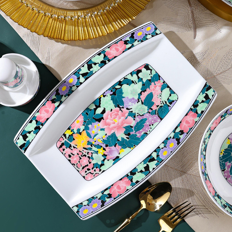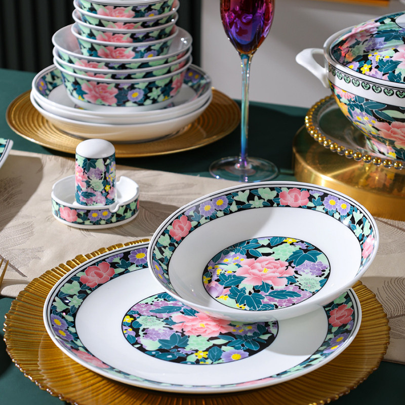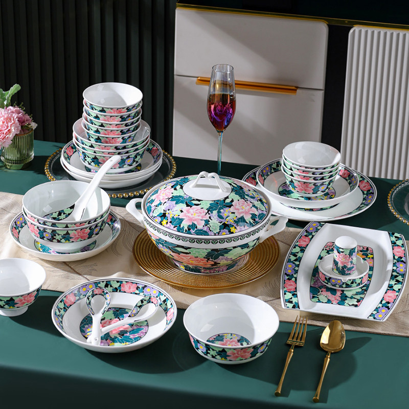 醴陵釉下彩满花碗碟套装家用骨瓷餐具米饭碗陶瓷面碗汤碗碗盘组合