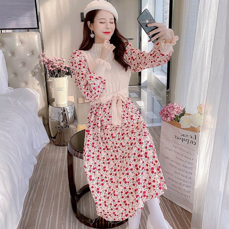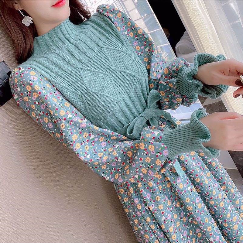 秋冬新款灯芯绒连衣裙配大衣的针织拼接长袖收腰打底中长款碎花裙