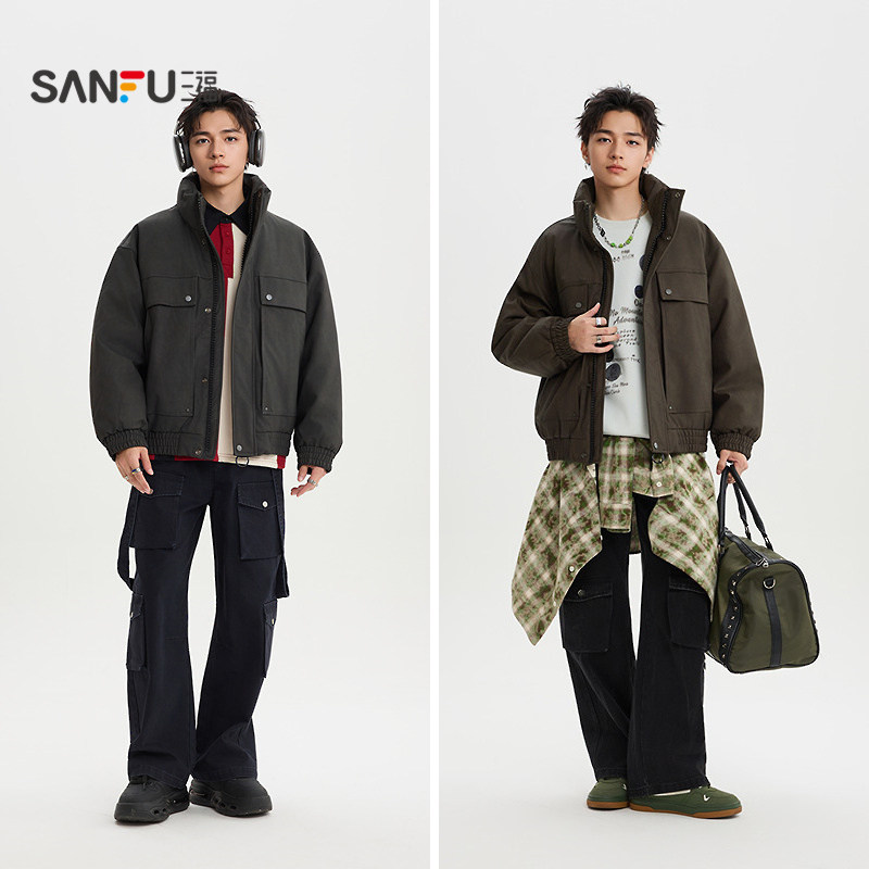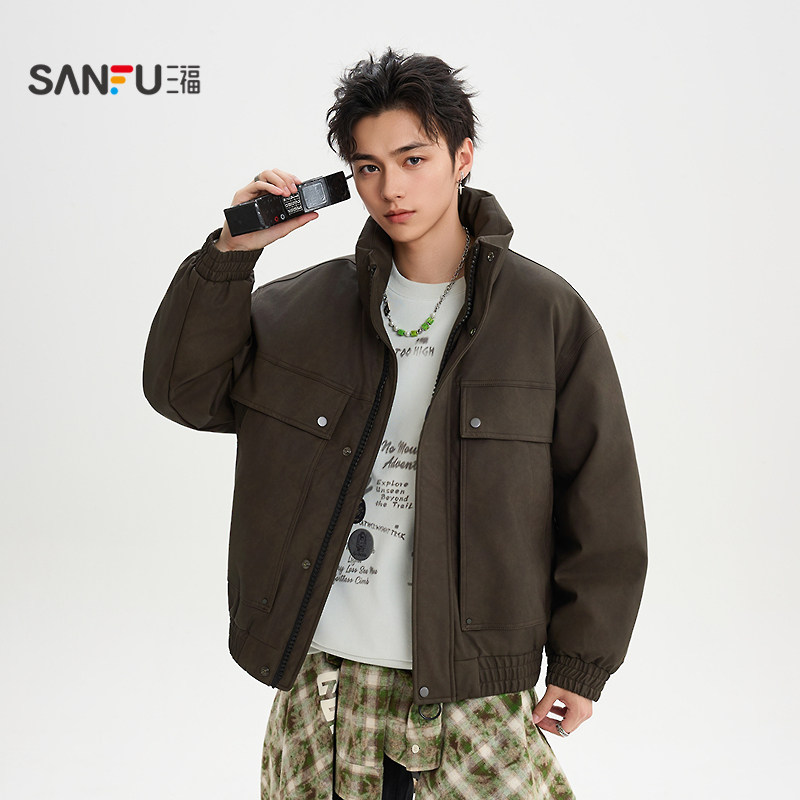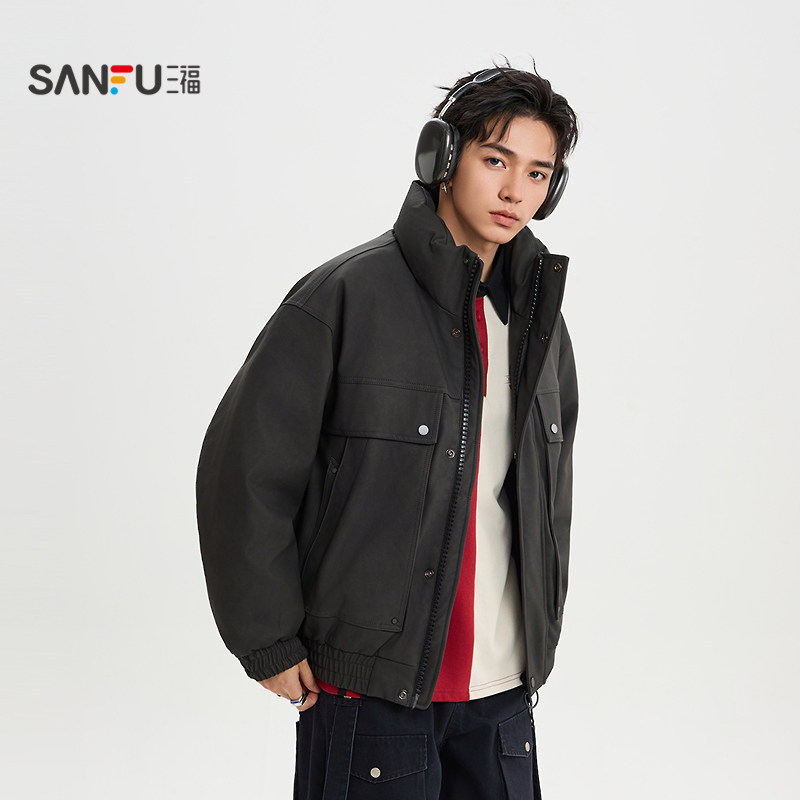 三福2025冬季男士双口袋PU皮羽绒服 保暖束口袖口立领外套512633