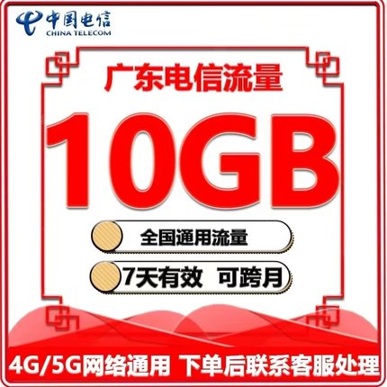 广东电信流量充值10G7天有效流量叠加包3/4/5G移动全国通用流量包