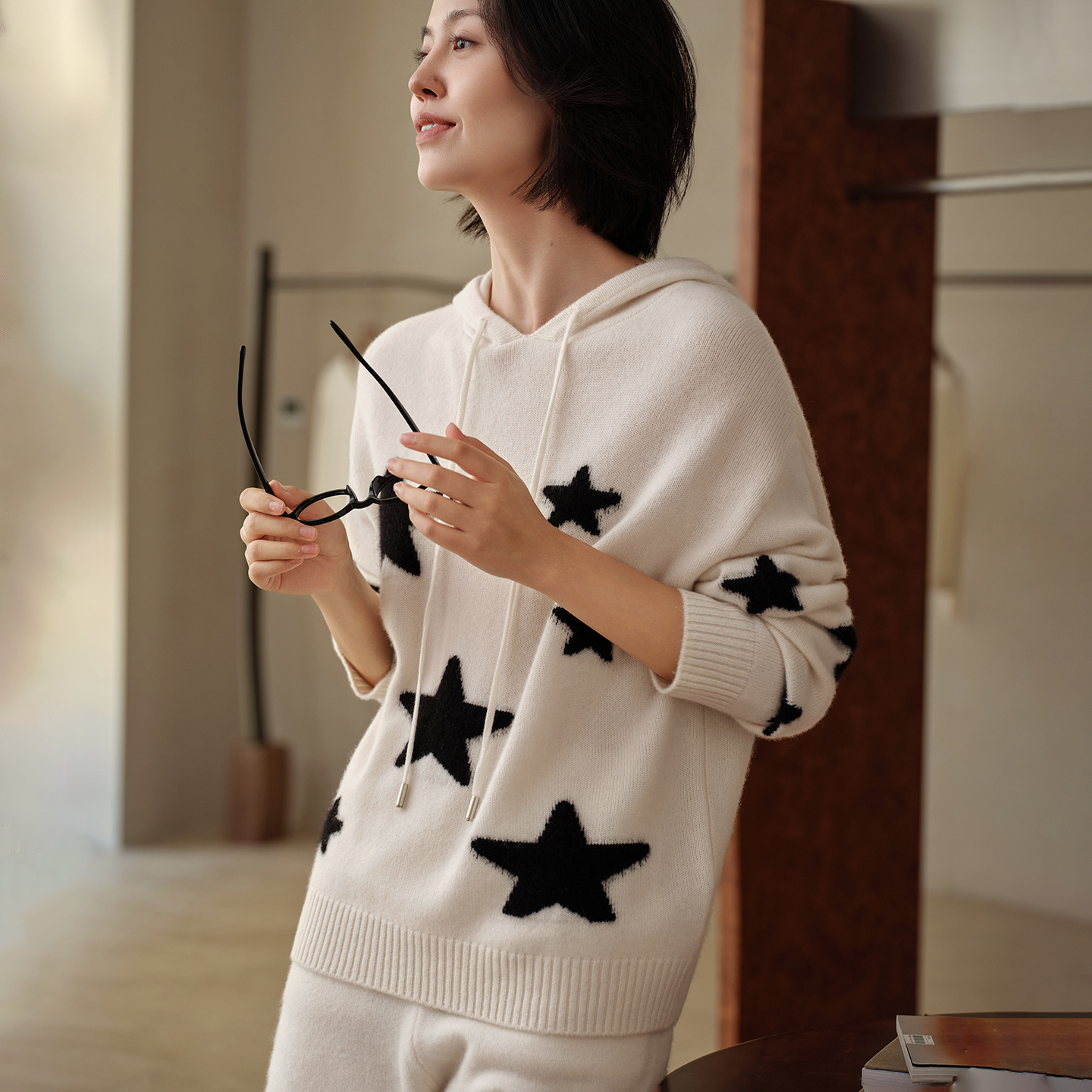 宽松慵懒100%纯山羊绒衫女连帽套头加厚长袖五星提花百搭针织上衣