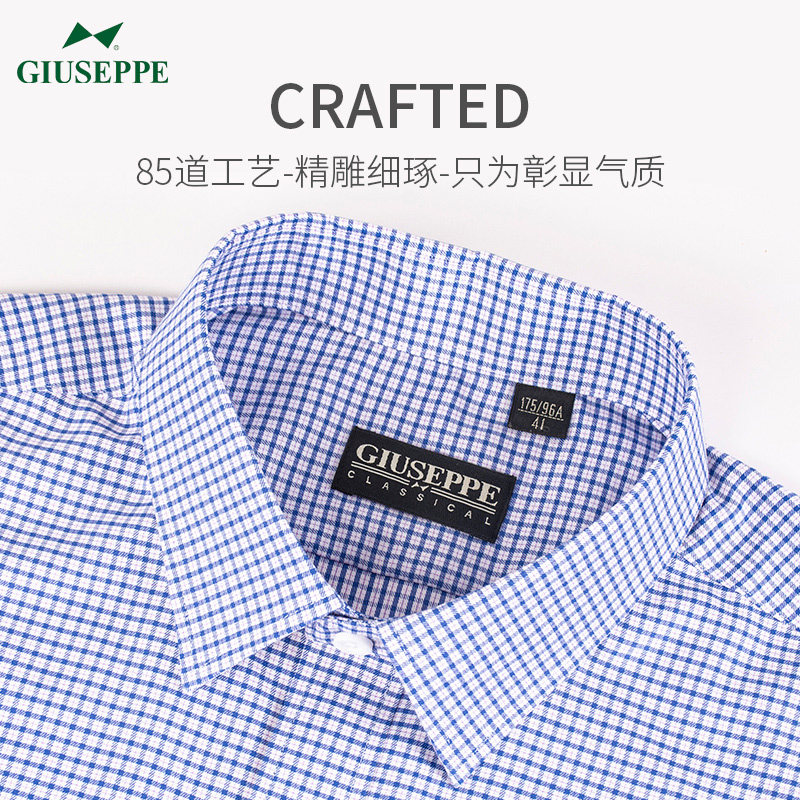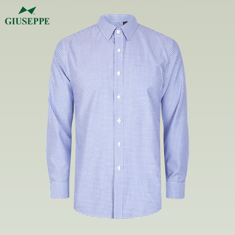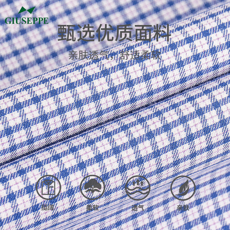 Giuseppe乔治白春秋男长袖衬衫方领蓝紫格绅士扣休闲衬衣有口袋