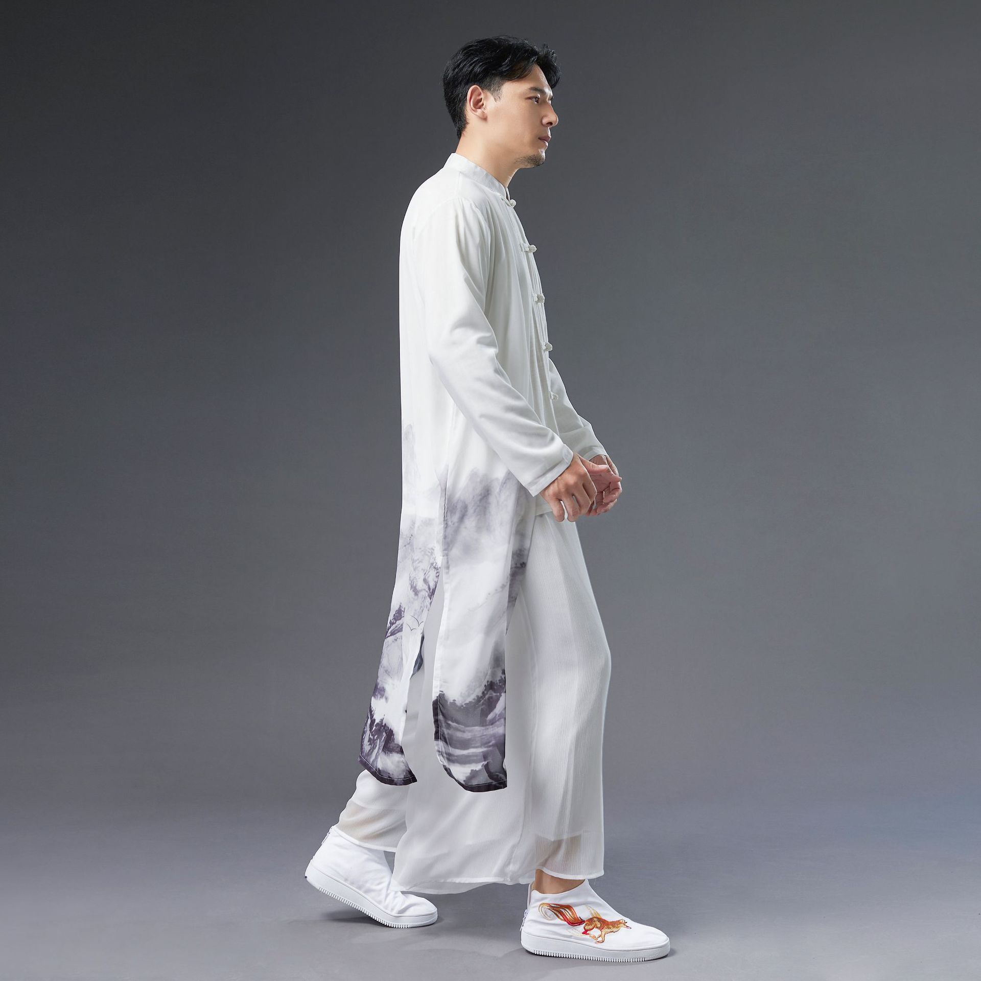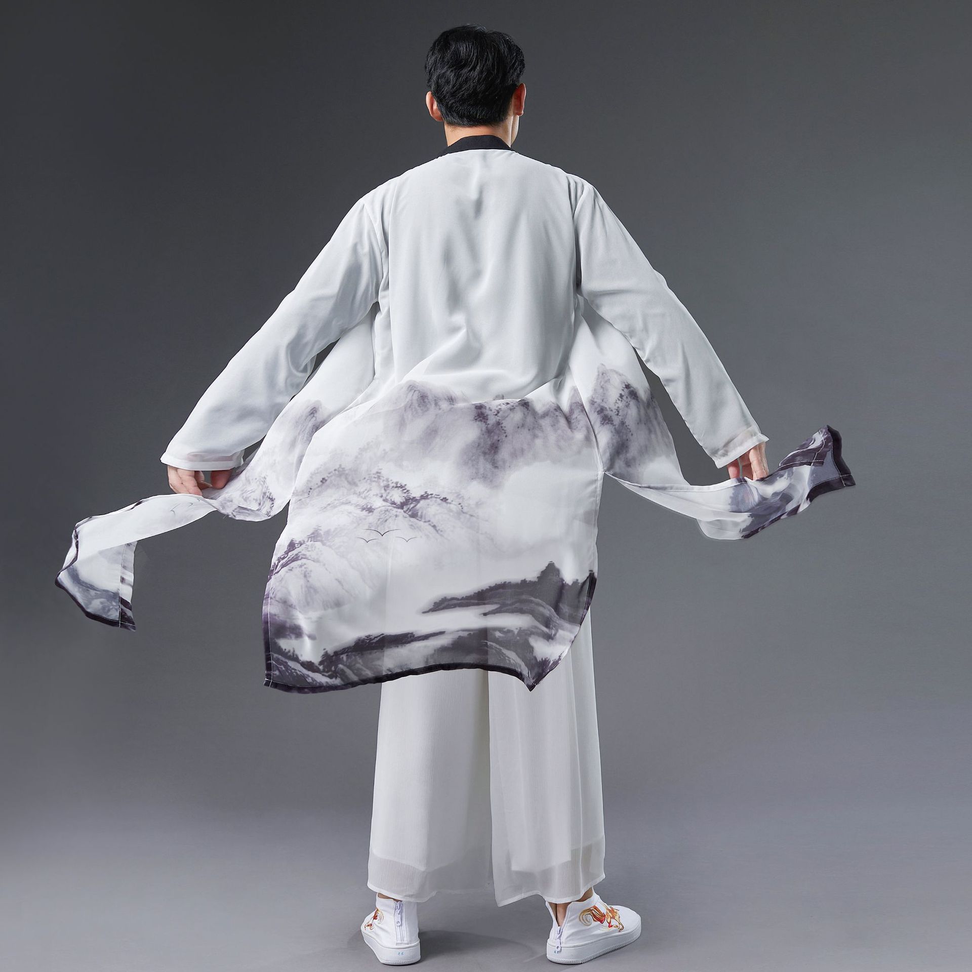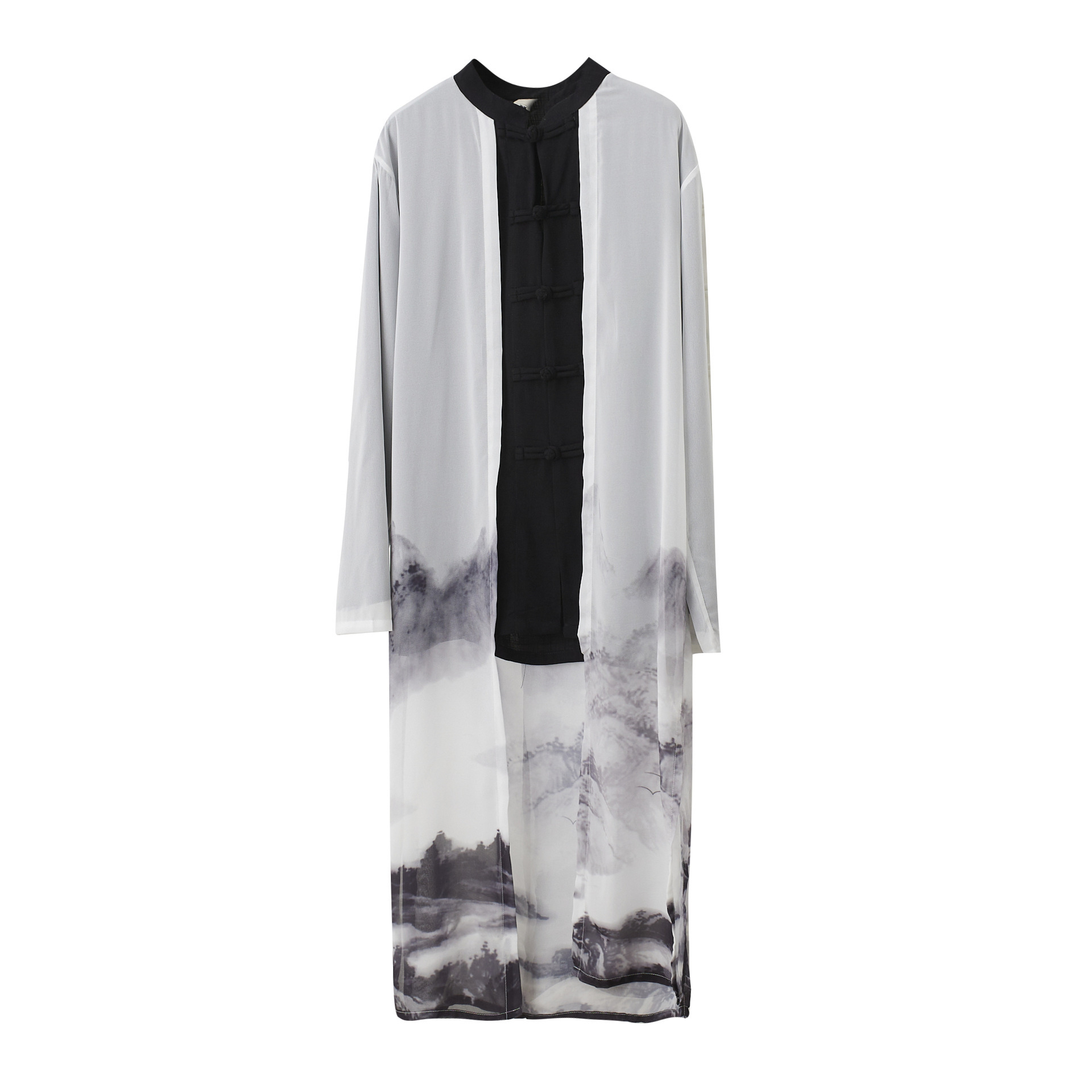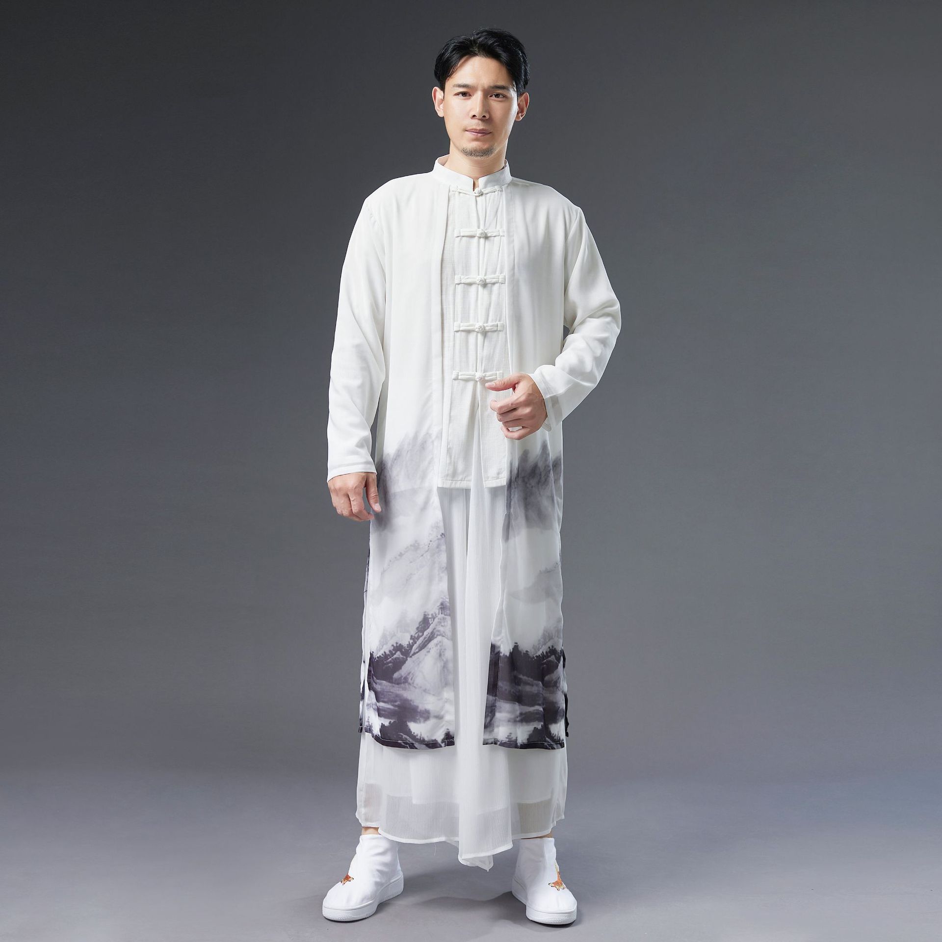 中国风夏季新款复古中式棉麻风衣长衫假俩件青年唐装汉服套装男士