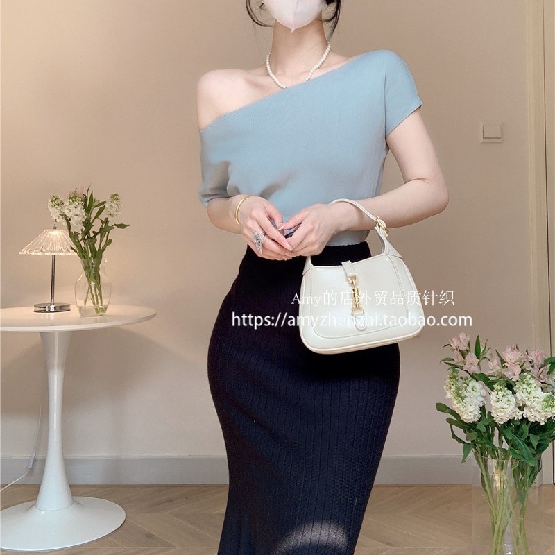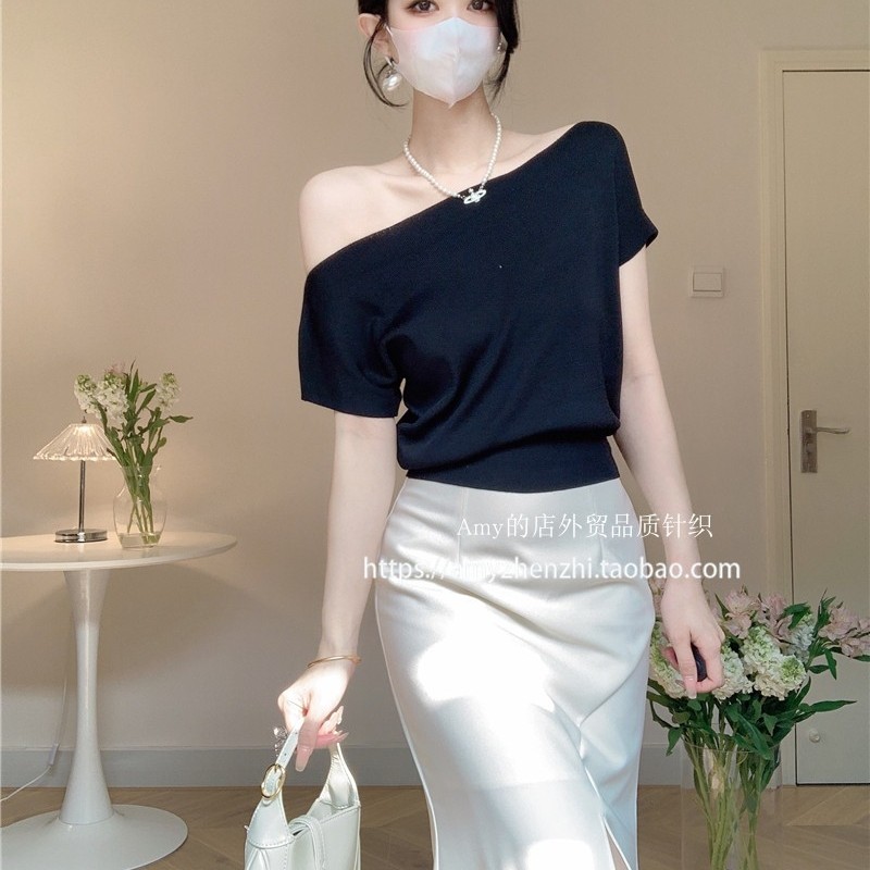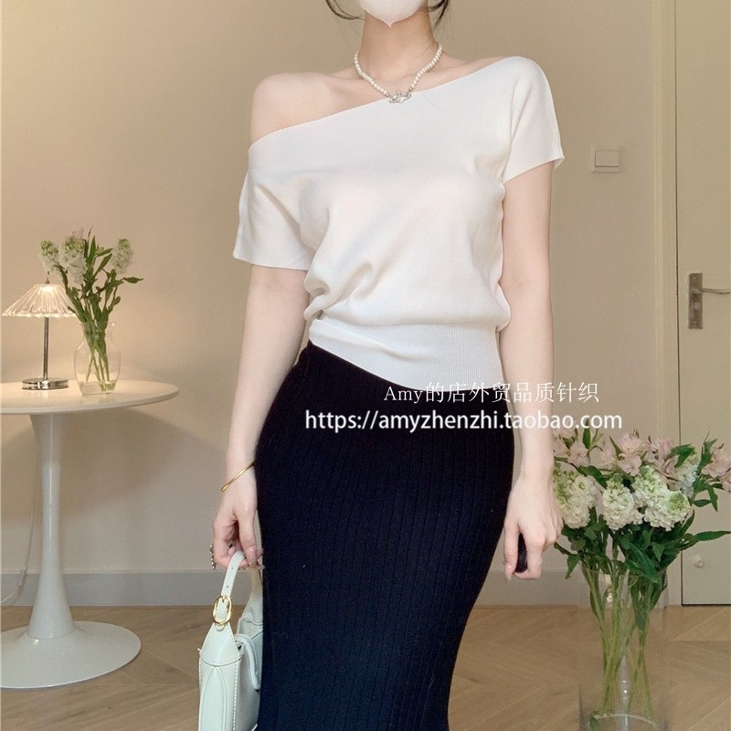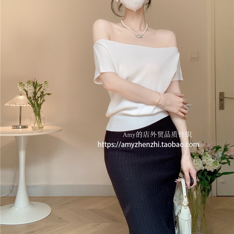 夏季女士短款冰丝针织衫上衣t恤短袖修身露肩一字领薄款显瘦小衫