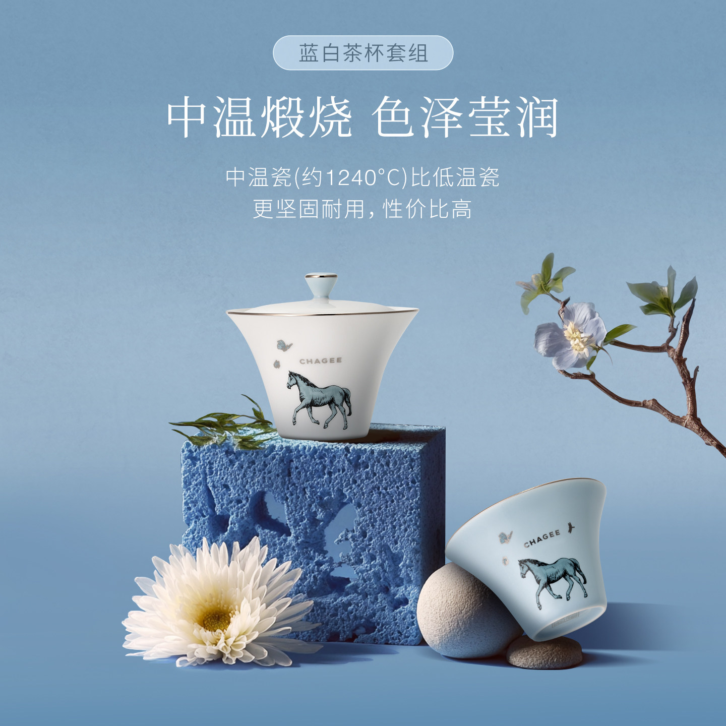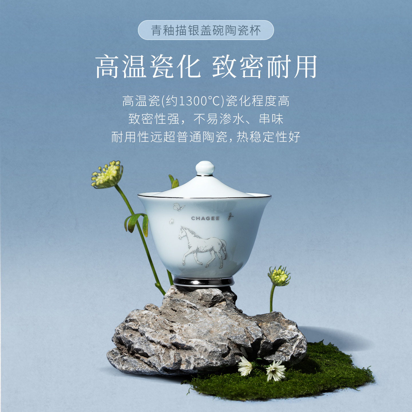 霸王茶姬茶具茶趣系列青釉描银盖碗陶瓷杯蓝白茶杯套组高档送礼