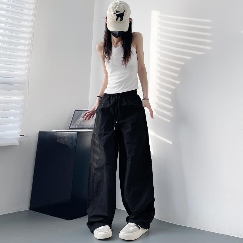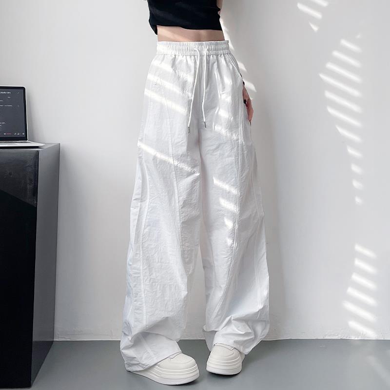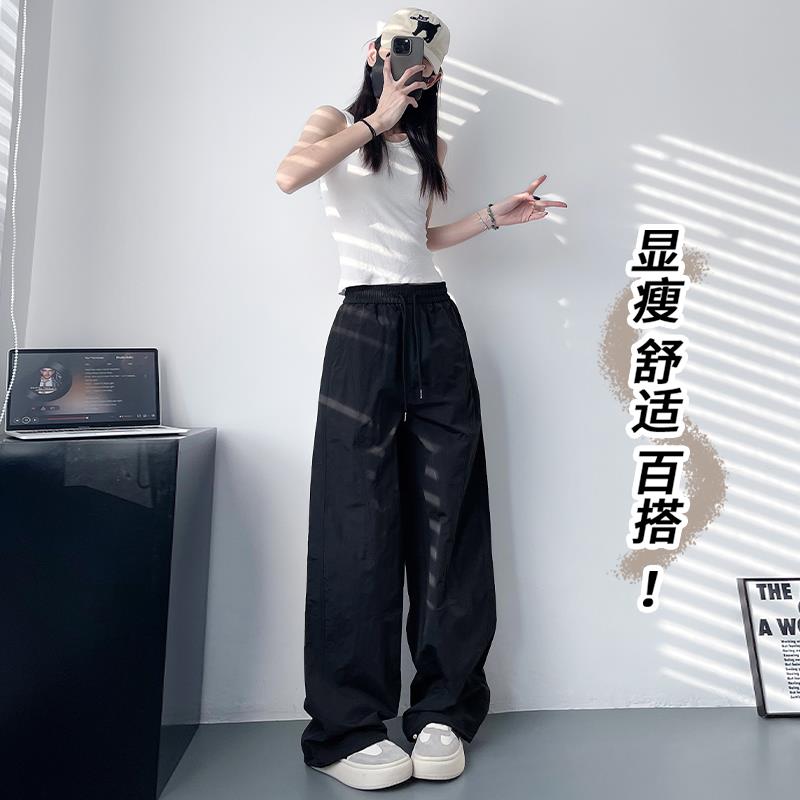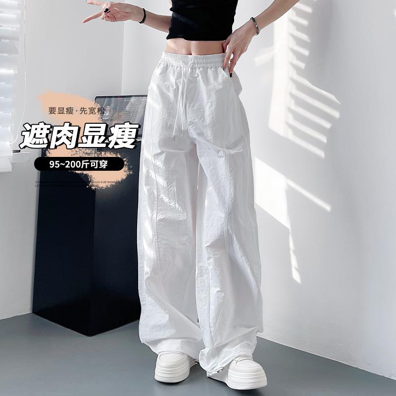 白色不透速干裤女夏季轻薄显瘦遮肉阔腿裤胖高腰褶皱运动工装裤