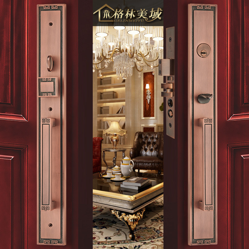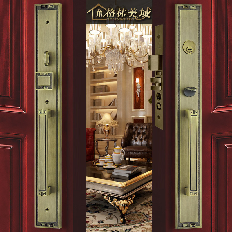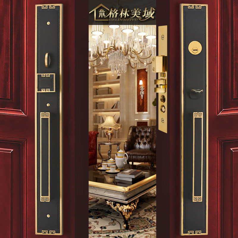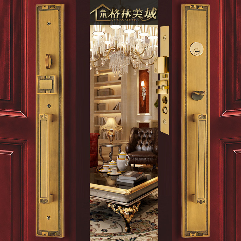 格林美域 中式黄铜别墅大门锁 实木双开门大把手锁对开入户门锁
