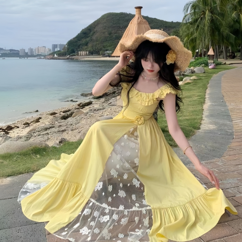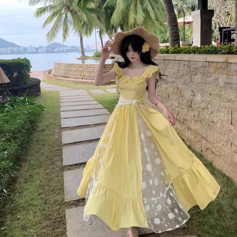 夏季新款奶黄小清新小飞袖吊带连衣裙大码荷叶边日系甜美公主长裙