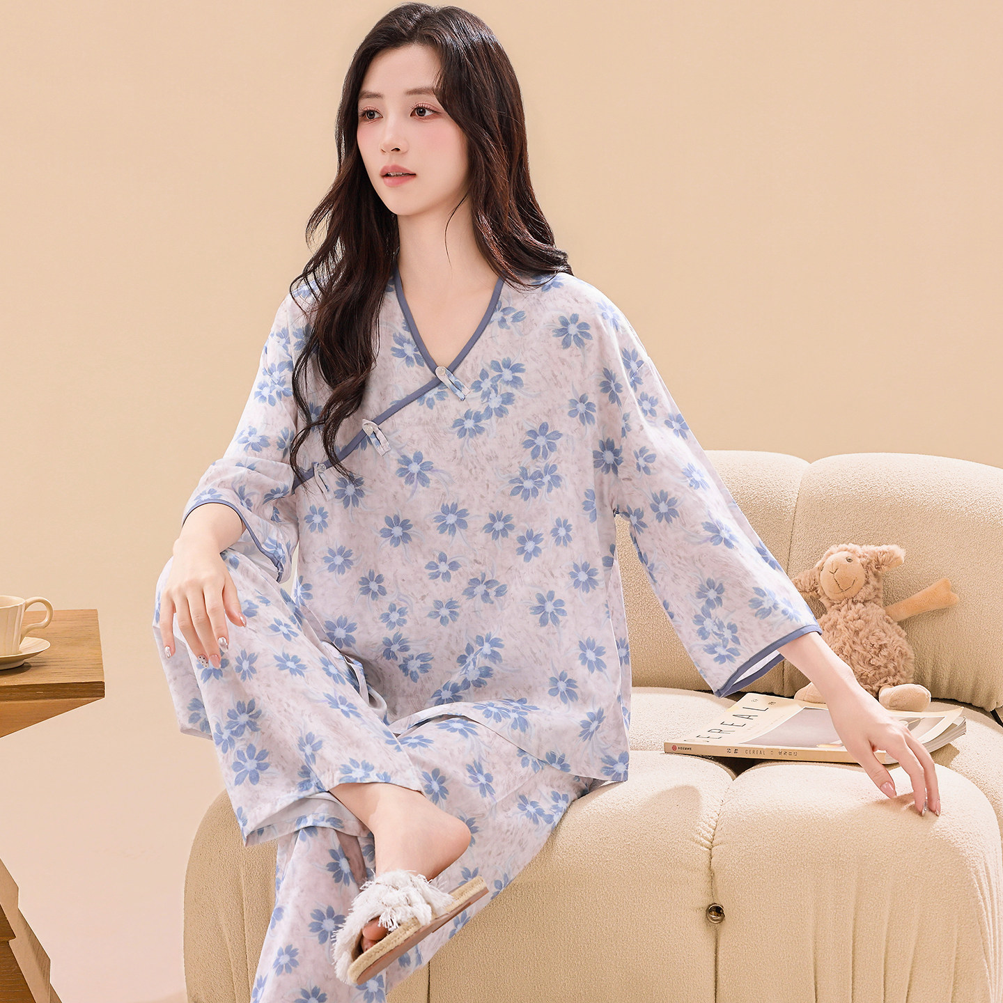 国风盘扣绵绸女睡衣套装甜美印花