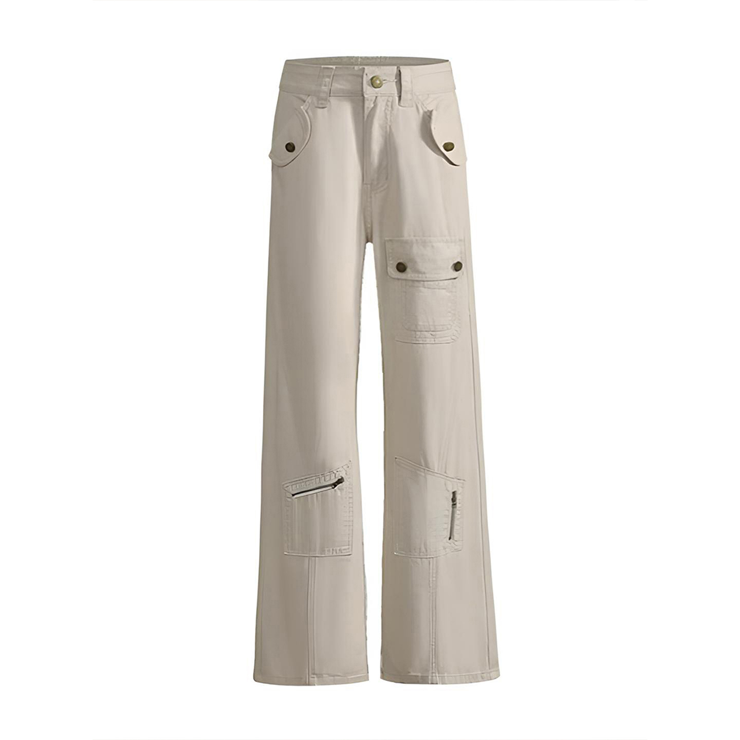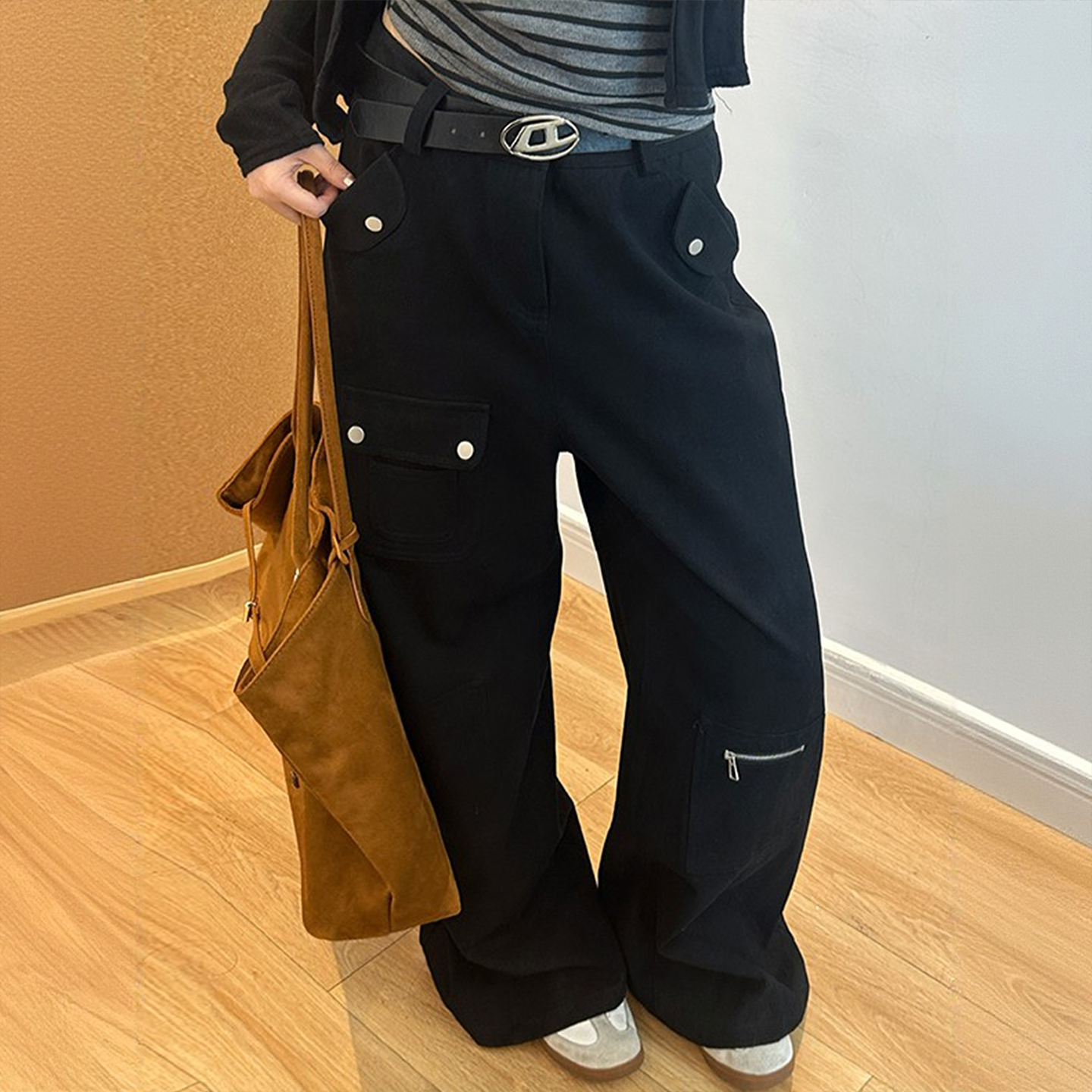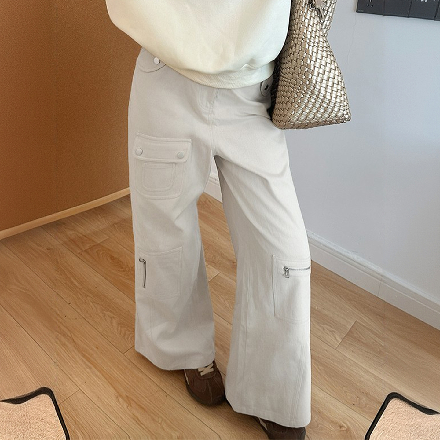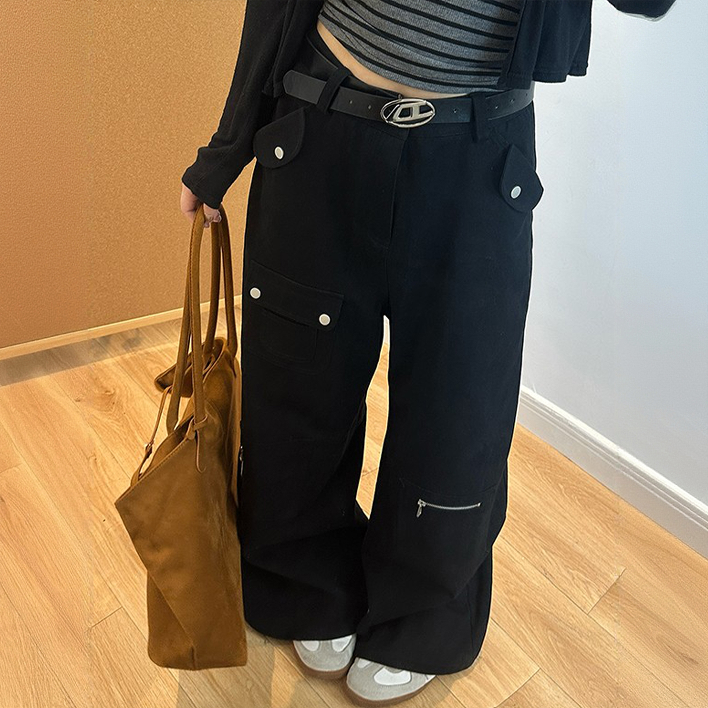 胖mm大码工装风多口袋阔腿牛仔裤女设计感减龄气质学生喇叭长裤子