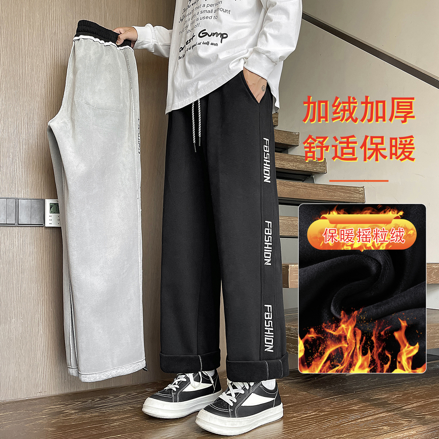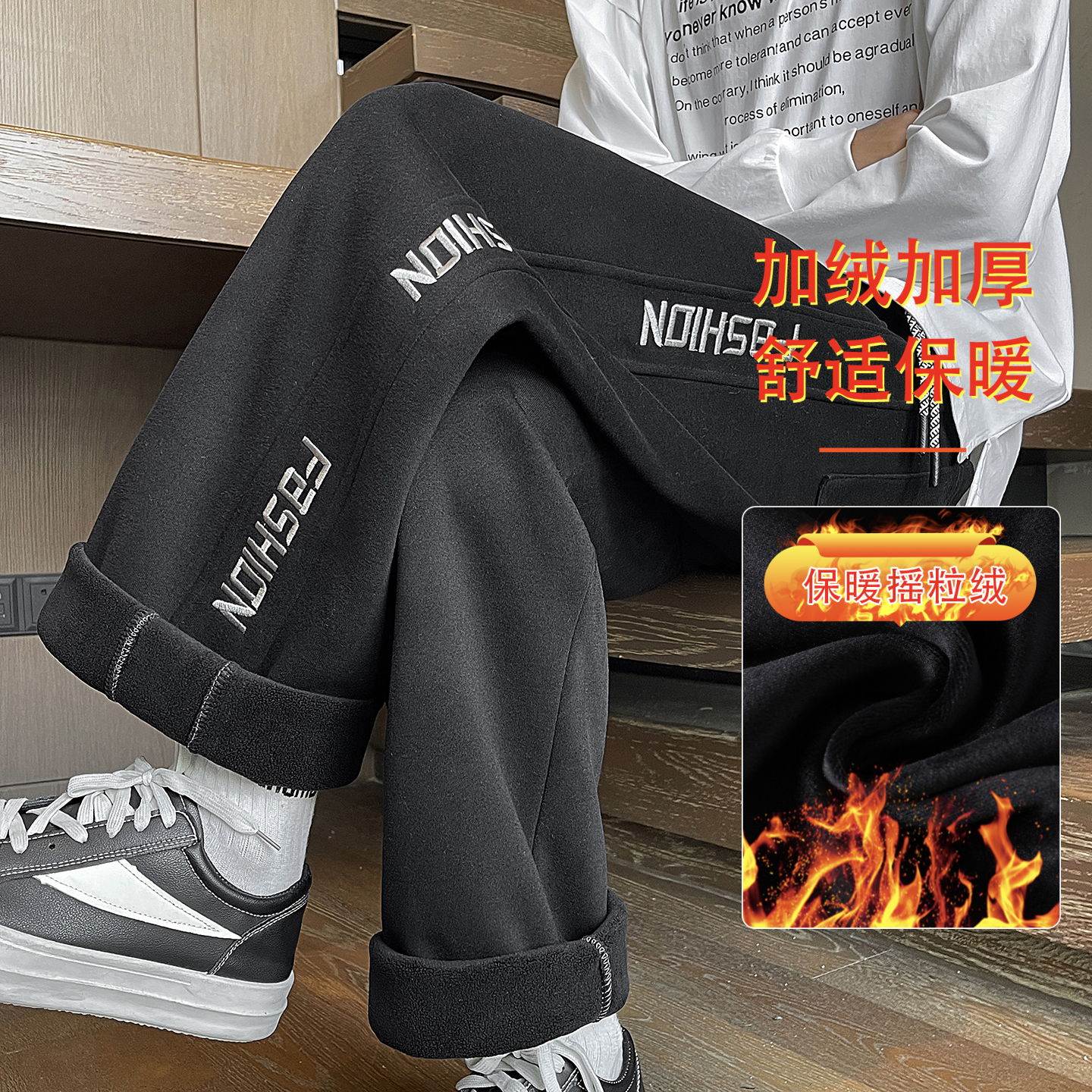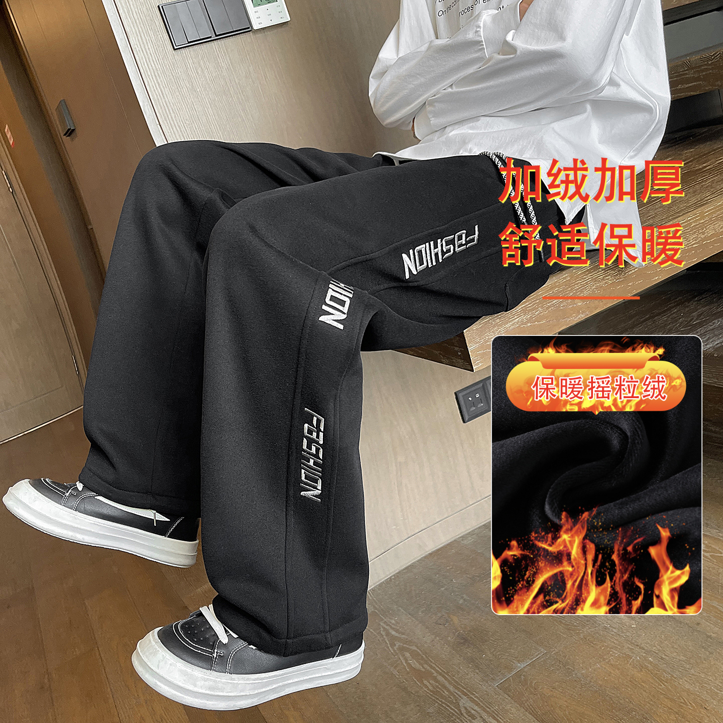 字母刺绣休闲长裤子冬季加绒加厚直筒卫裤男款青少年宽松运动以純