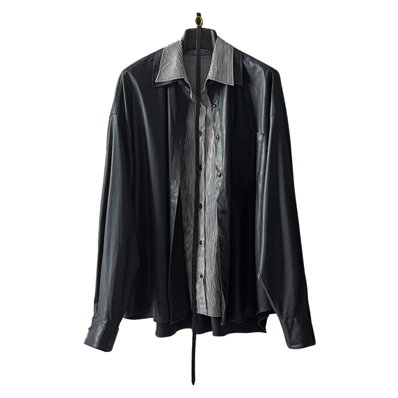 SUNSHINE 秋季新品环保pu皮衣叠穿假两件条纹衬衫通勤上衣女外套