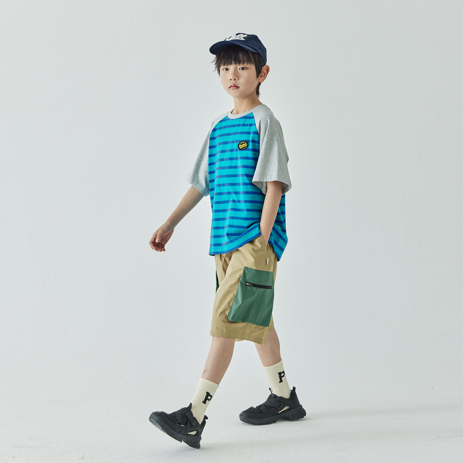 蓝汽水2025夏季新款男童拼色条纹T恤中大童圆领插肩袖短袖上衣
