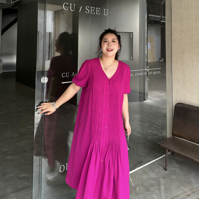 大码女装v领压褶衬衫裙200斤胖妹妹mm宽松遮肚子显瘦中长款连衣裙