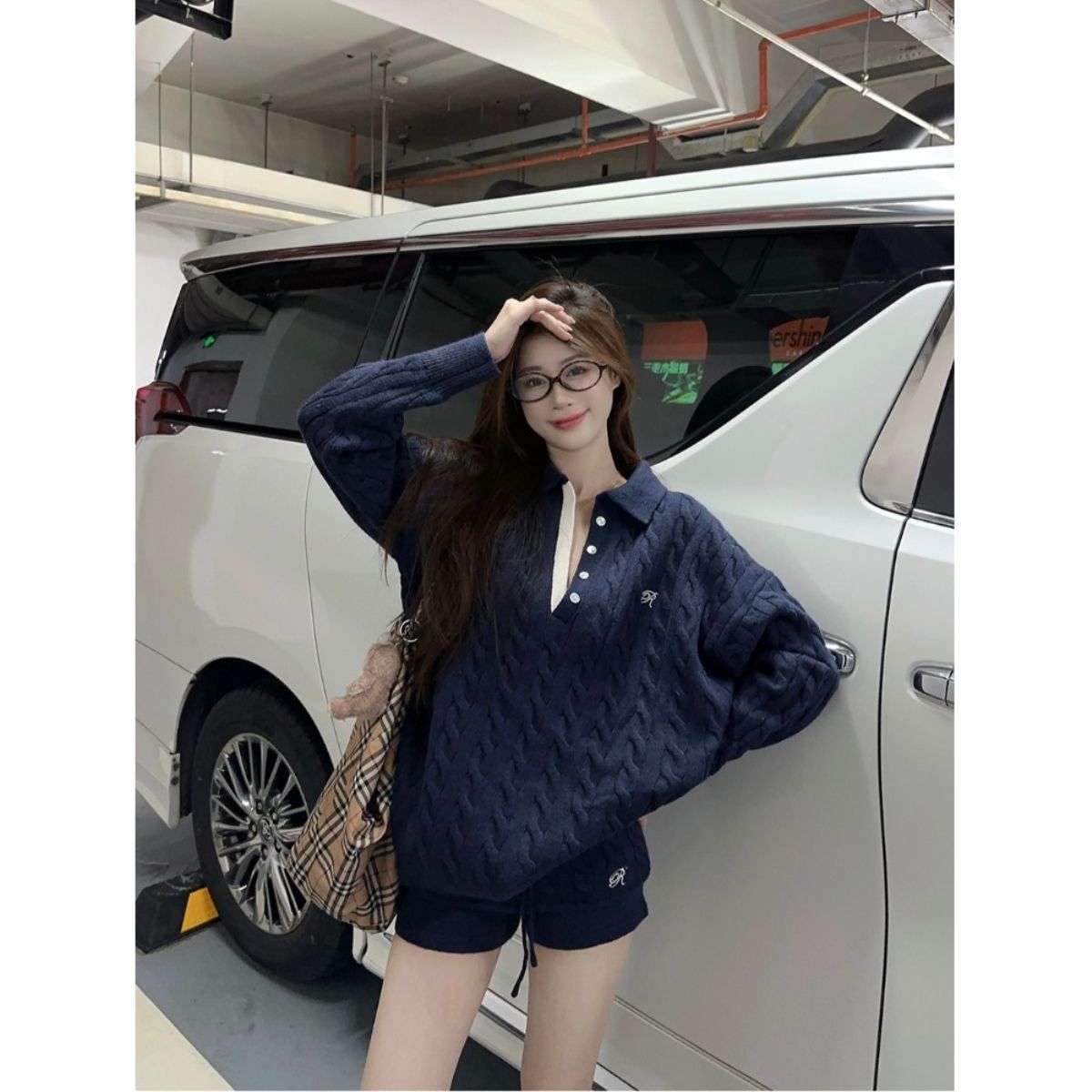 2024新款休闲套装女藏青色翻领麻花毛衣秋冬松紧腰包臀短裤两件套