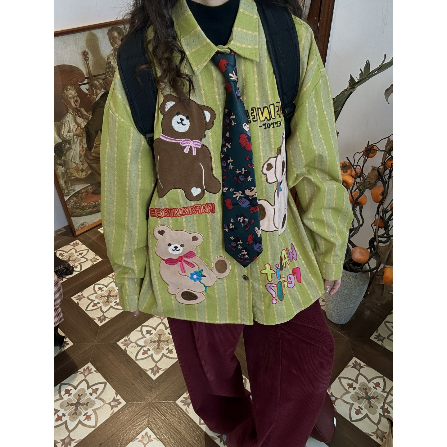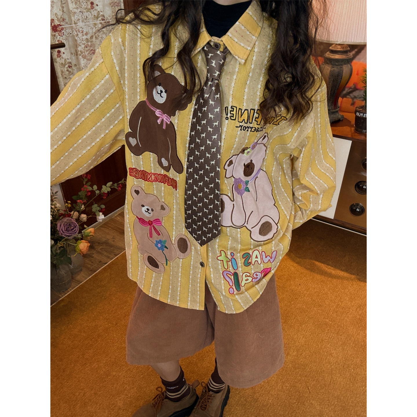 C2自制/日系复古趣味卡通小熊条纹衬衫女秋季提花宽松长袖衬衣潮