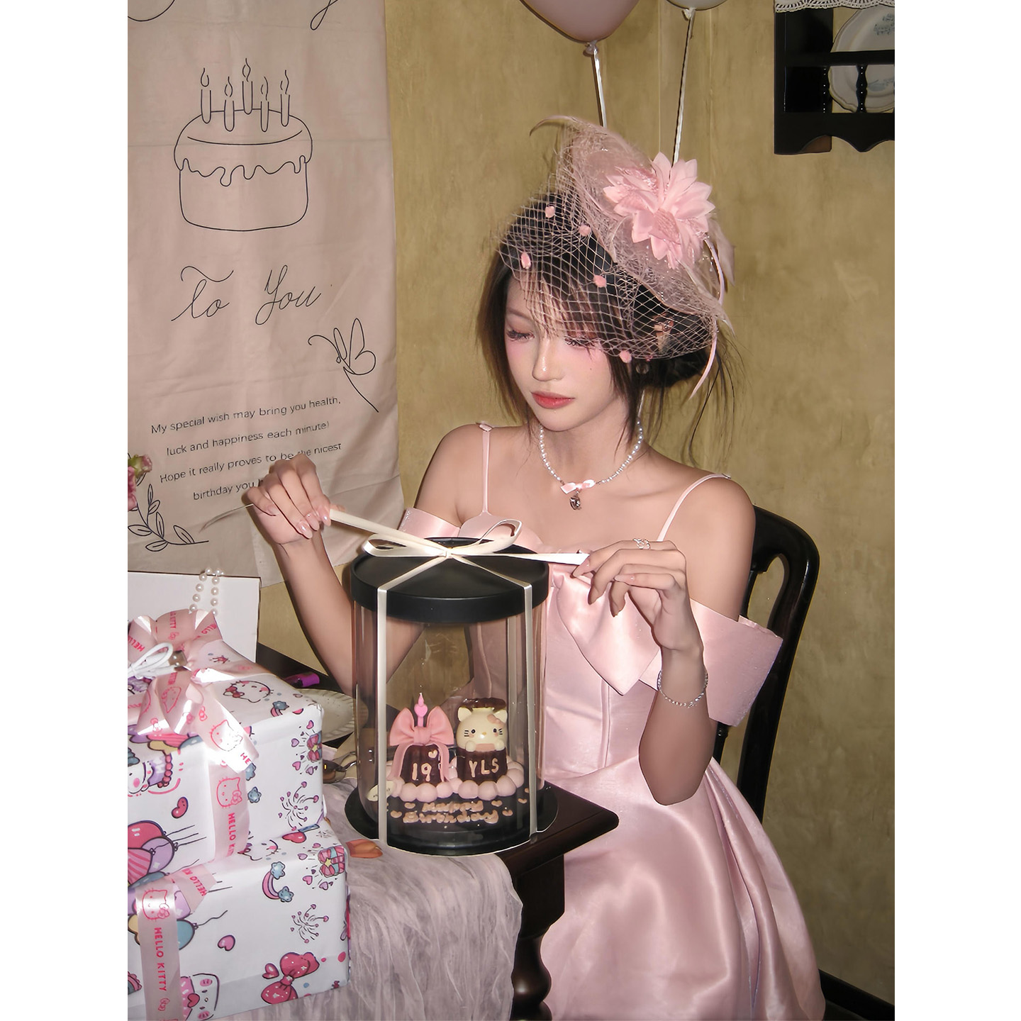 XZY 微胖甜美粉色蝴蝶结抹胸连衣裙女纯欲气质收腰生日礼服公主裙