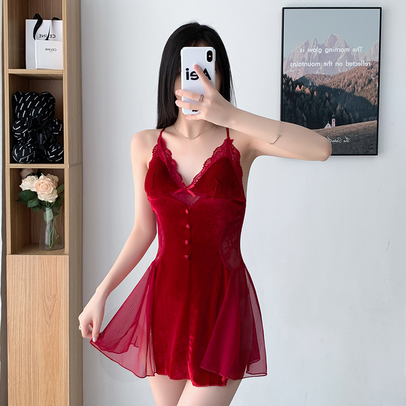 睡衣女秋冬款金丝绒性感吊带睡裙内衣带胸垫红色高级感家居服短裙