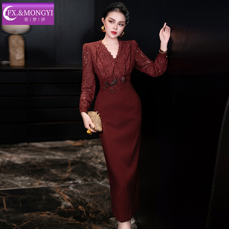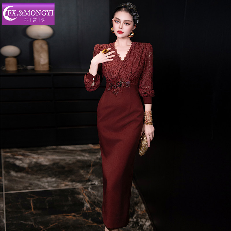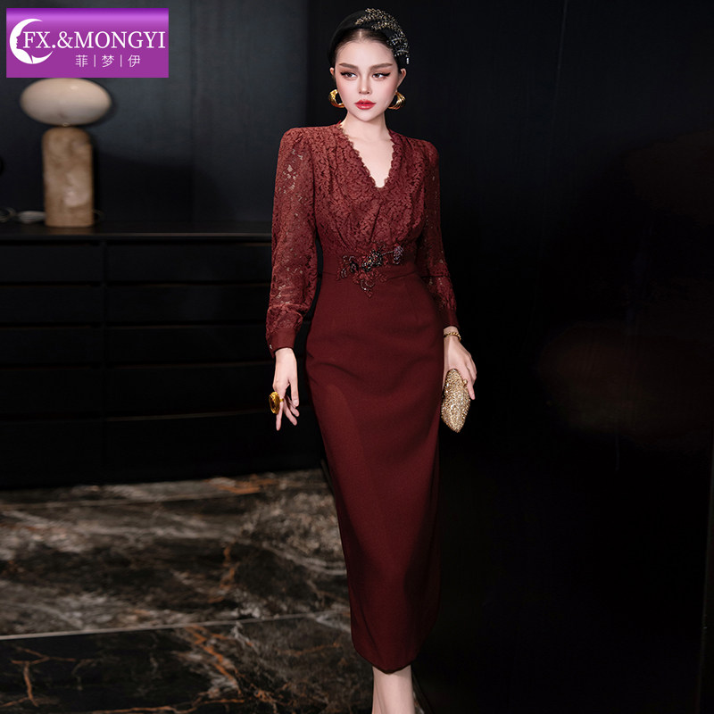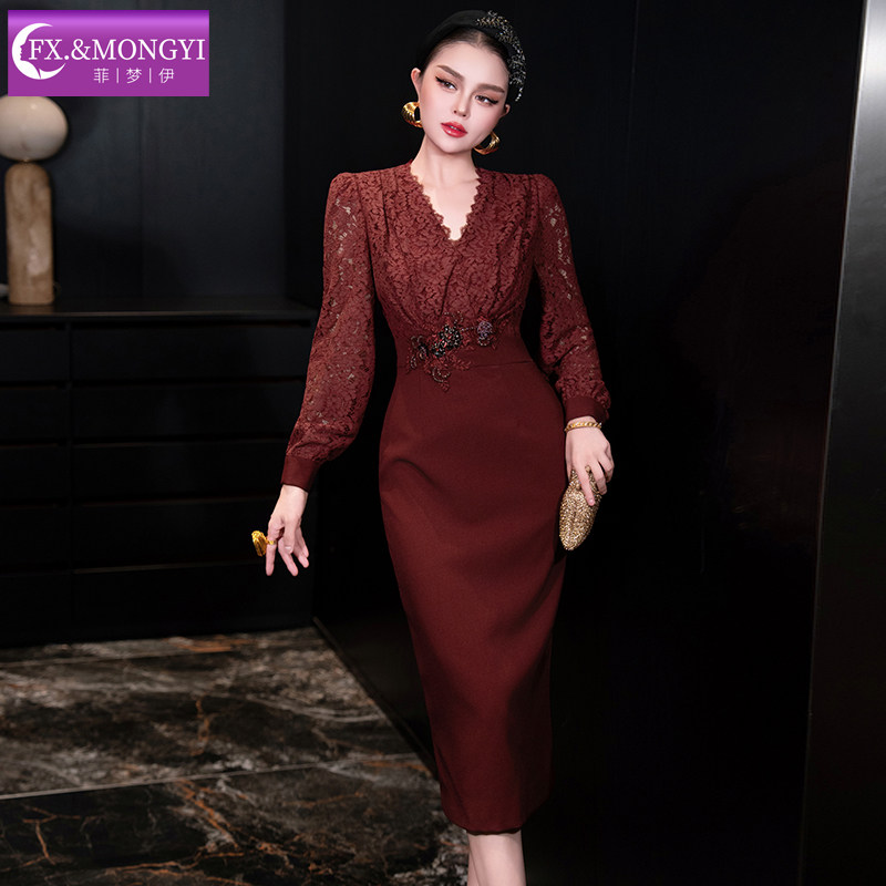 菲梦伊蕾丝红色连衣裙女长袖秋装轻熟名媛高端收腰假两件包臀裙子