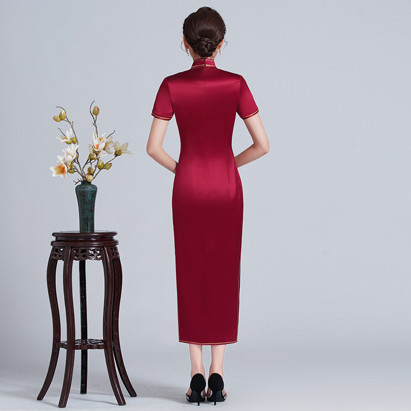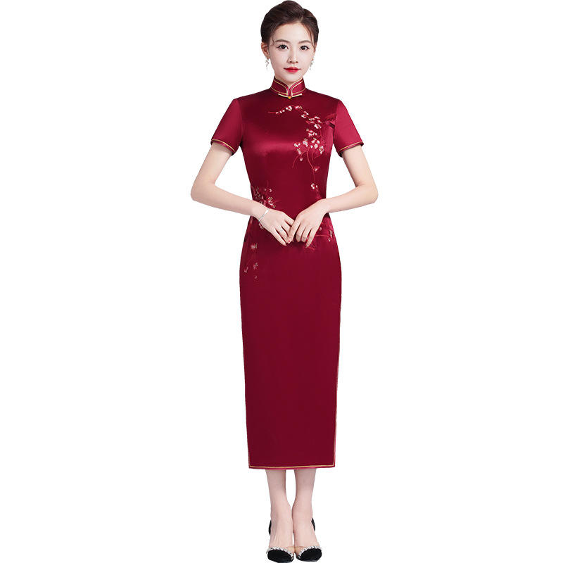 2022款喜婆婆旗袍改良酒红刺绣高贵妈妈婚宴装婚庆敬酒礼服中长款