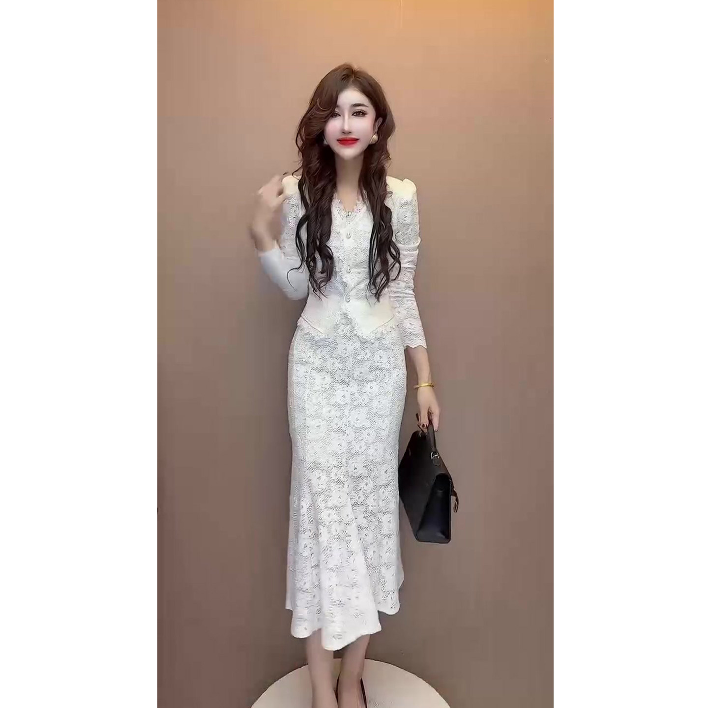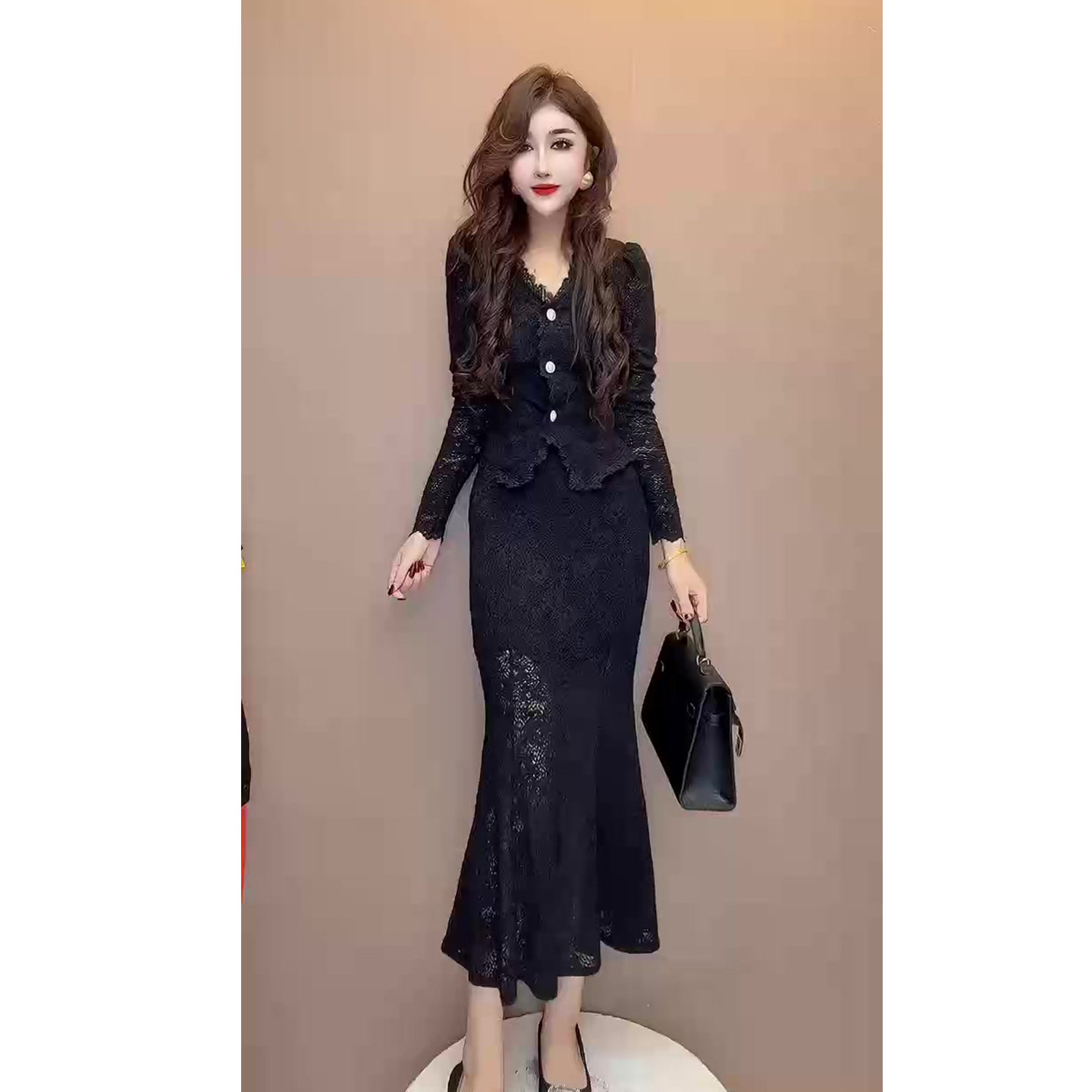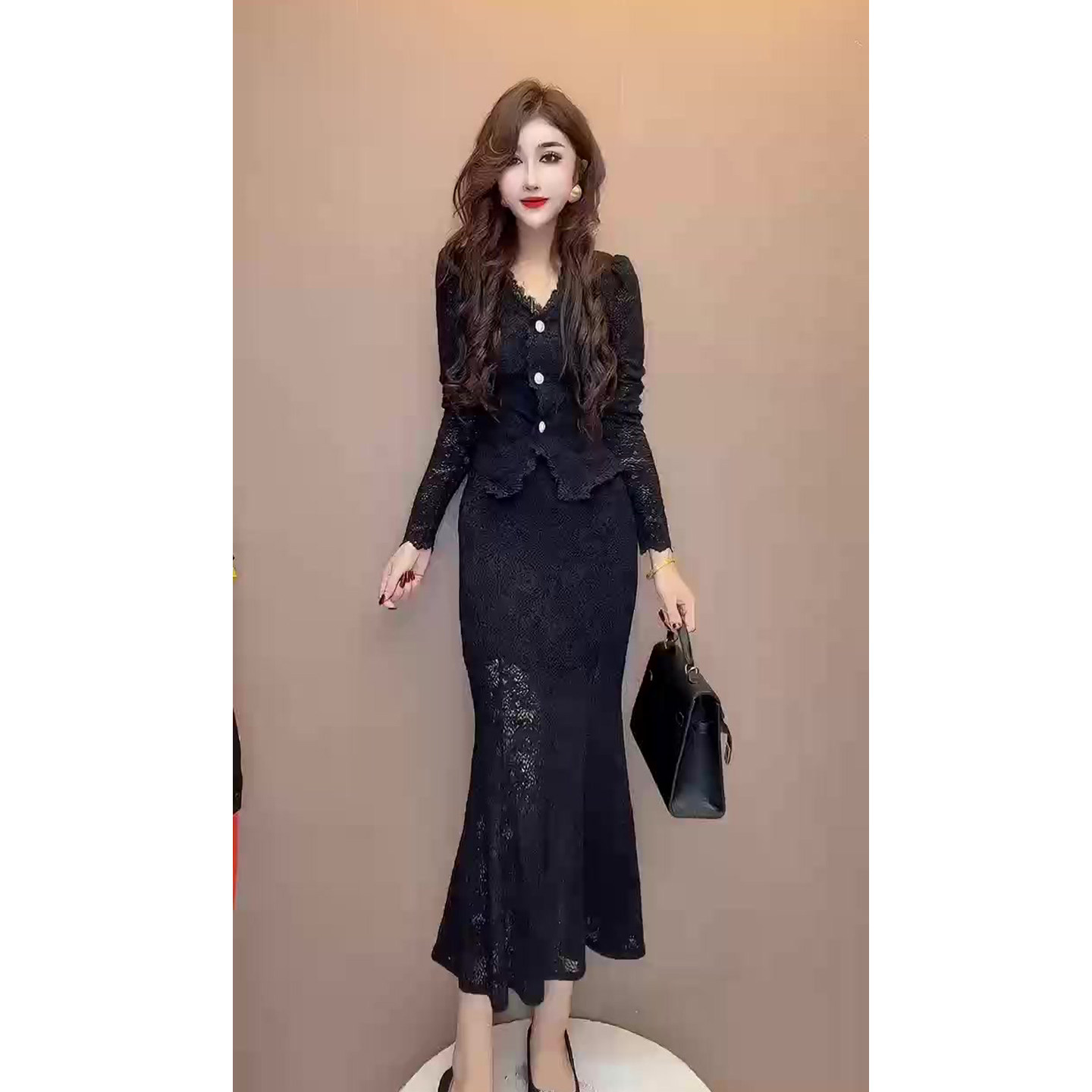 赫本小香风时尚套装女秋季新款蕾丝上衣+包臀鱼尾裙两件晚宴礼服