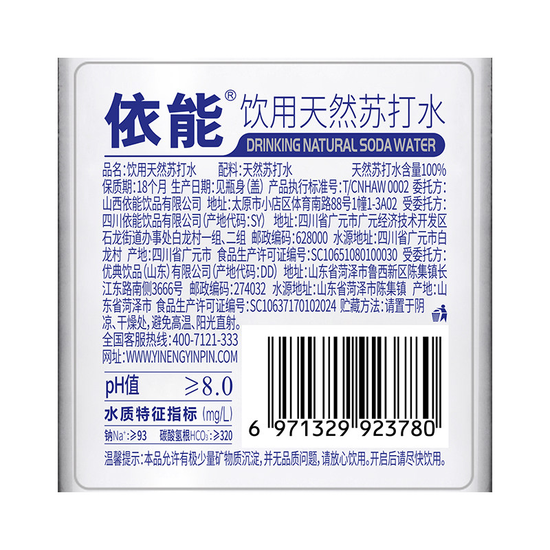 依能饮用天然苏打水整箱小瓶弱碱性水非矿泉水无糖无气瓶装