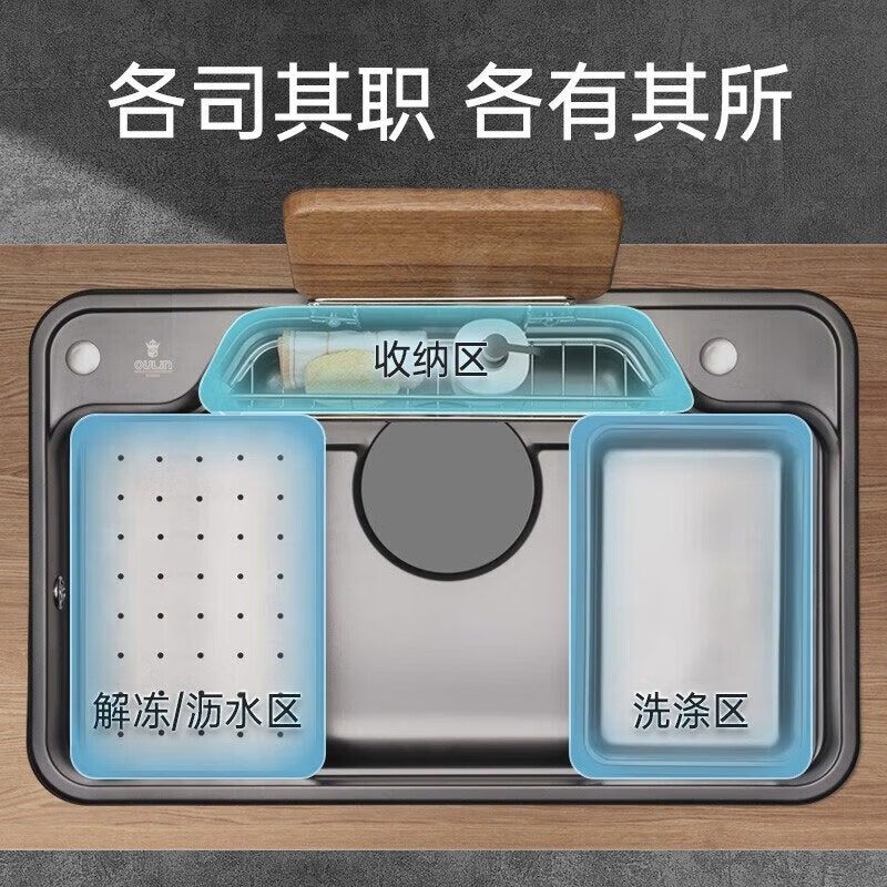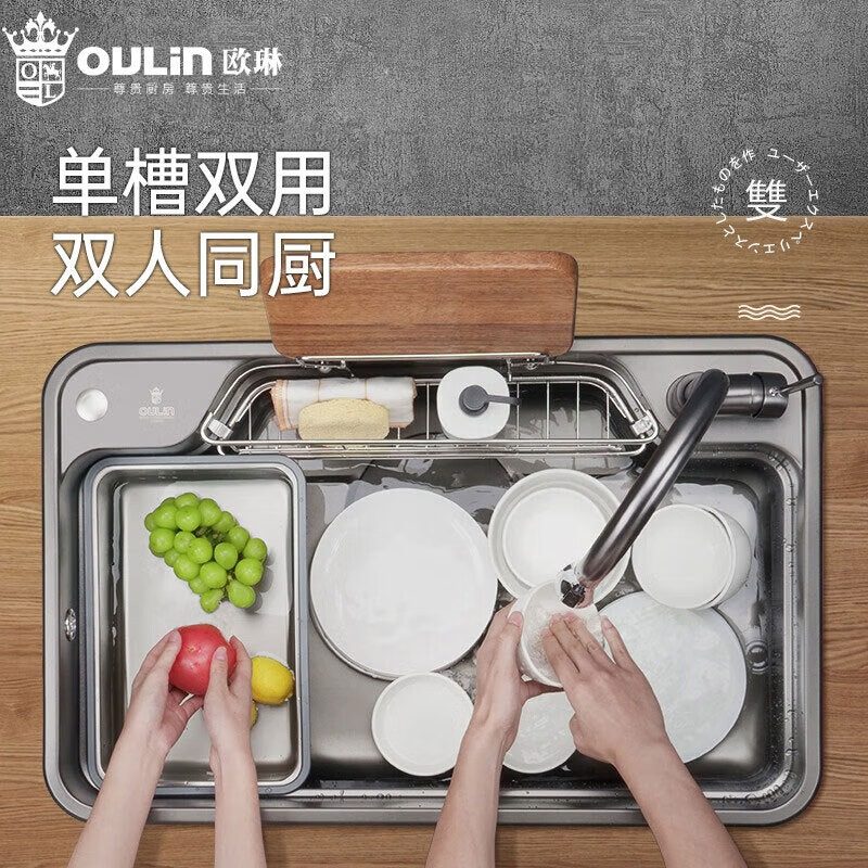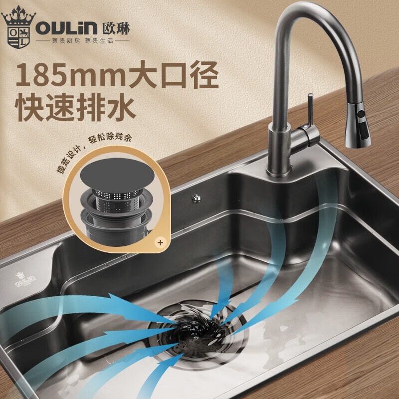 欧琳日式大单槽纳米水槽304不锈钢厨房洗菜盆枪灰色一体盆9149H