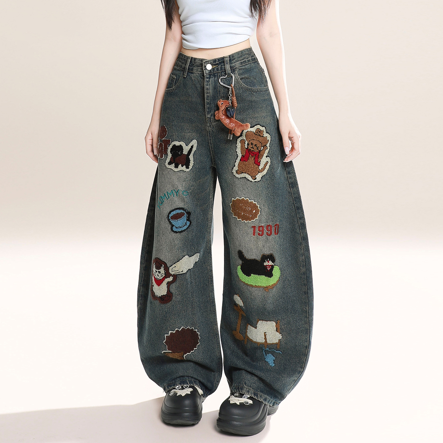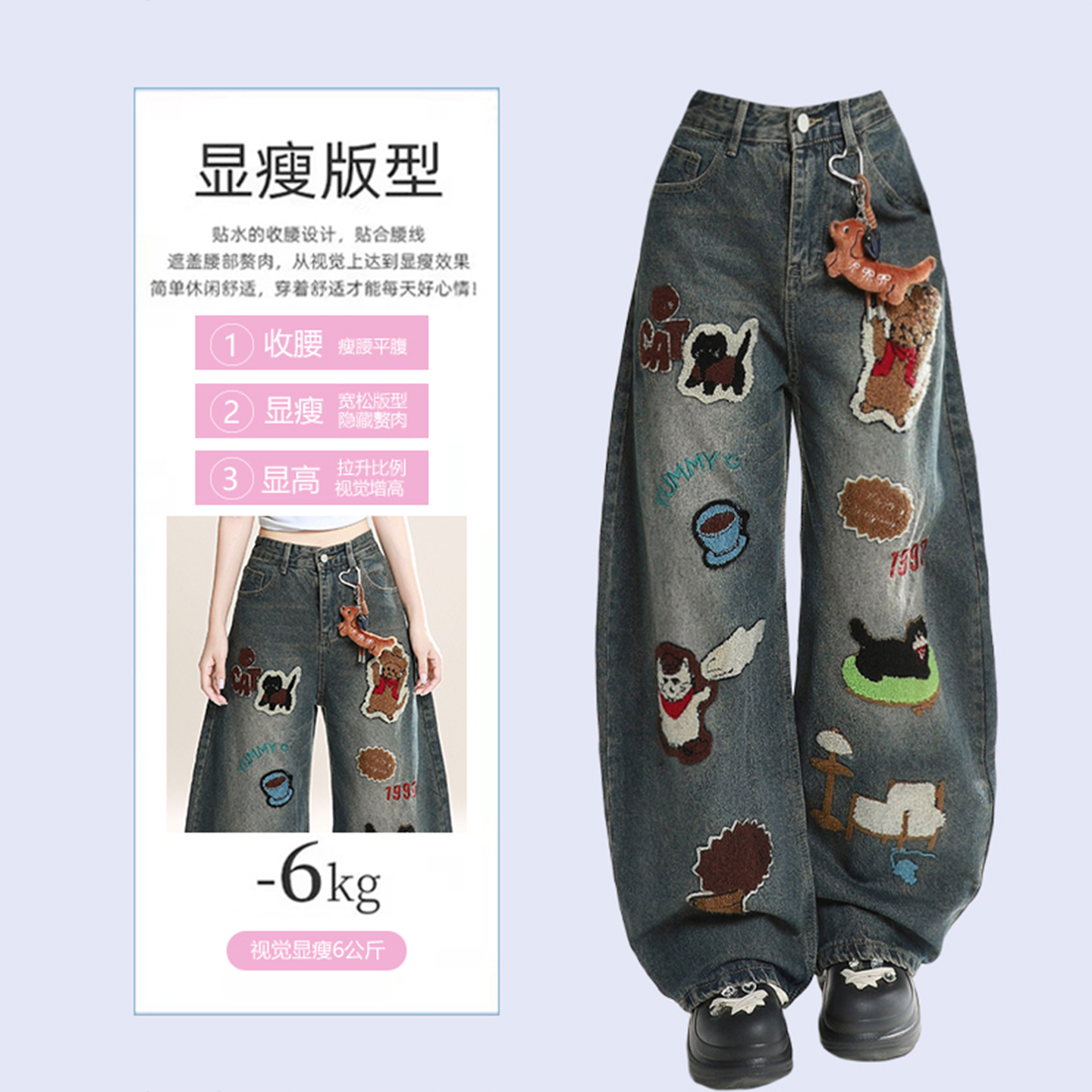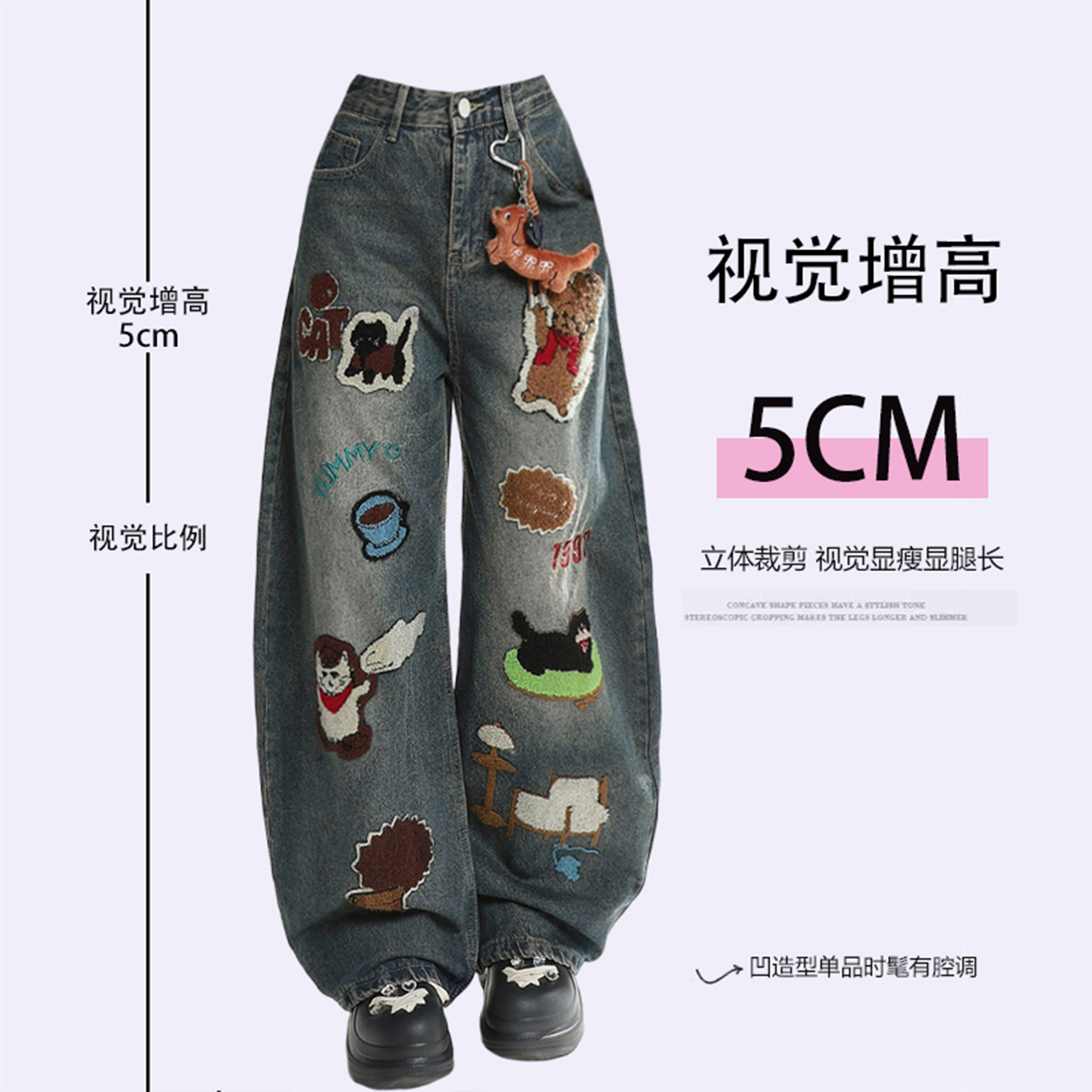 300斤大码女装卡通贴布阔腿牛仔裤女胖mm美式高街宽松显瘦长裤子