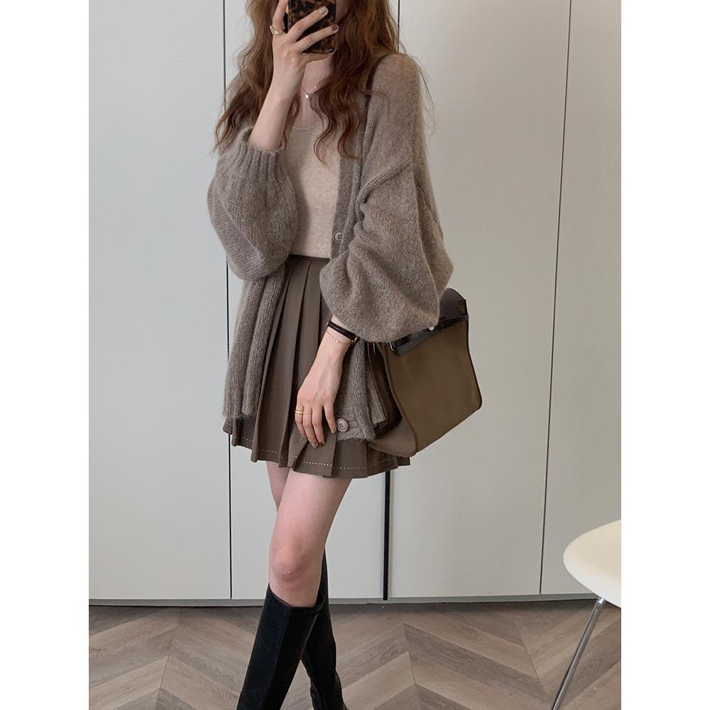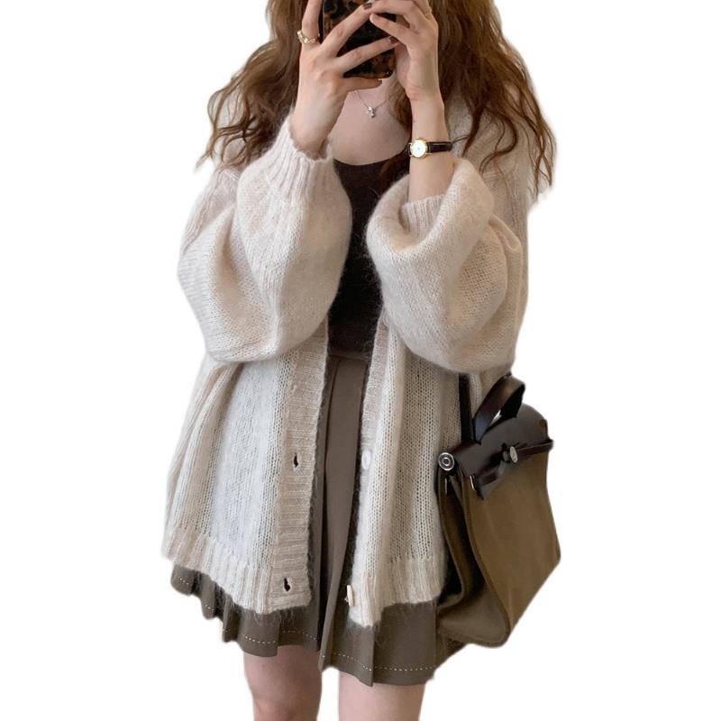 泡泡袖杏色针织外套开衫女早春薄款宽松慵懒风日系覆古马海毛毛衣