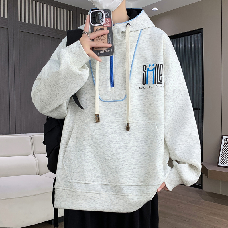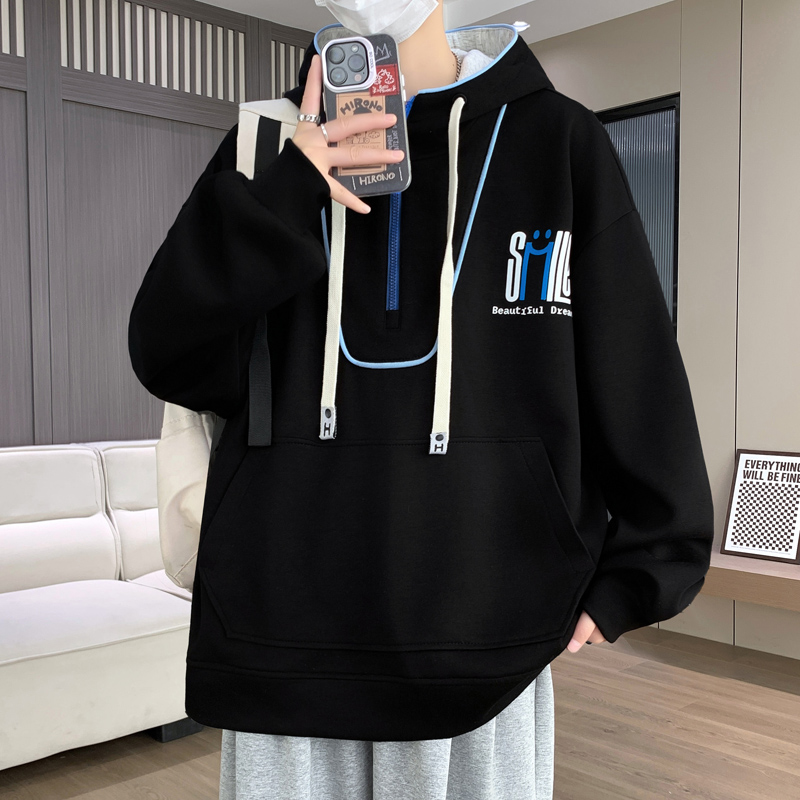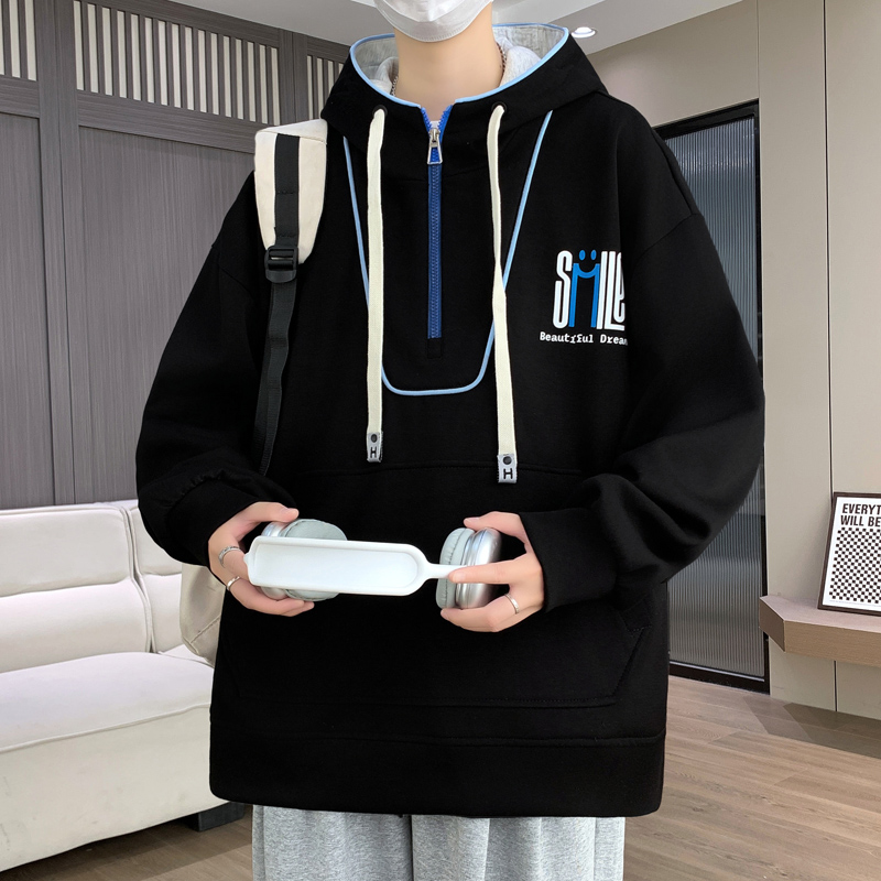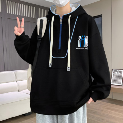 设计感半拉链套头卫衣男春秋季初高中学生连帽上衣青少年大童外套
