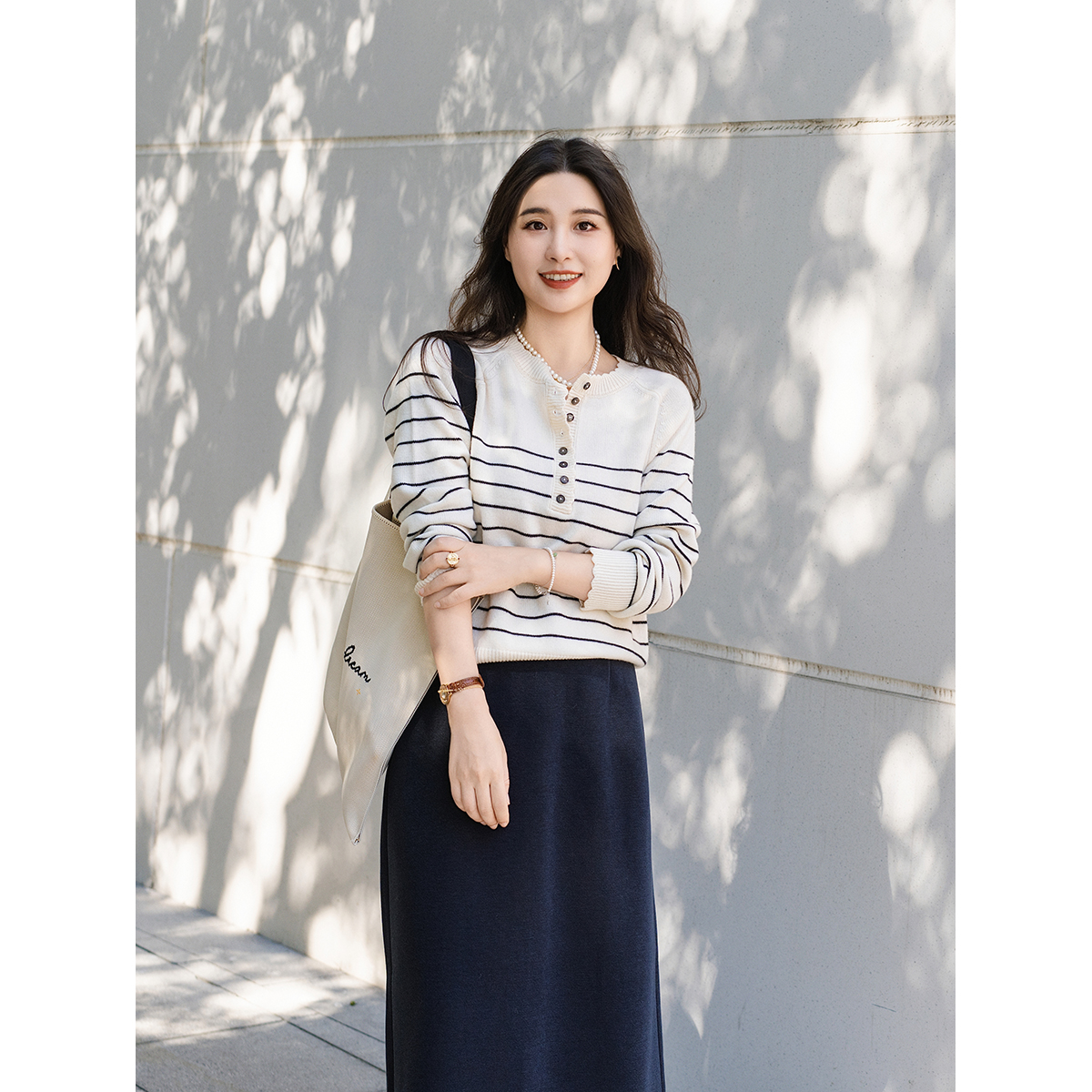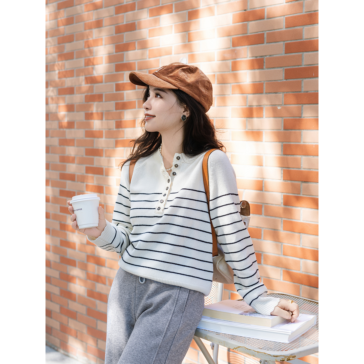 apipedream如一梦美利奴绵羊毛花边亨利领条纹针织衫/胶片日记